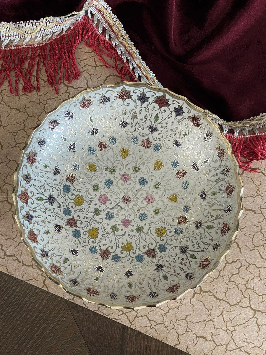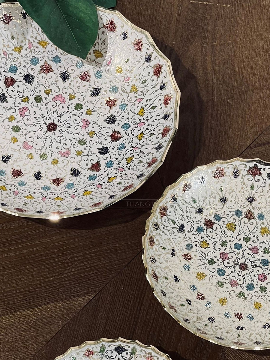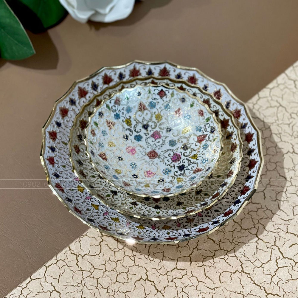 Trên bề mặt mỗi bát có họa tiết hoa lá đặc trưng cho văn hóa Ấn Độ. Bên ngoài bát là lớp mạ vàng công nghiệp tạo nên độ sang trọng. Viền bát uốn lượn giống như cánh hoa. Bộ bát có thể dùng để trưng bày hoặc đựng hoa quả, bánh kẹo,… hay làm quà tặng tân gia, đám cưới.