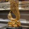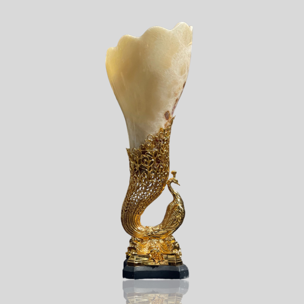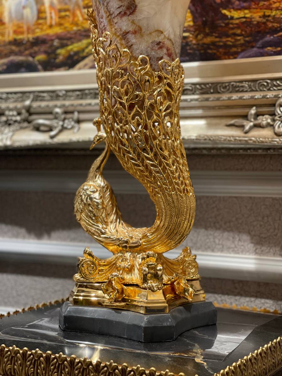 Điểm nhấn của bình ngoài vẻ đẹp trời ban còn được tôn lên bởi các hoa văn đồng hình công mạ vàng chạm khắc thủ công một cách tinh xảo. Chân bình hình ảnh chim công ôm tròn quanh bình được gắn kết với nhau phần miệng bình bằng đá cẩm thạch xòe tròn tạo hình là 1 chiếc đuôi công tượng trưng quyền lực, giàu sang, phú quý. Có thể gọi là tuyệt tác 1 – 0 – 2