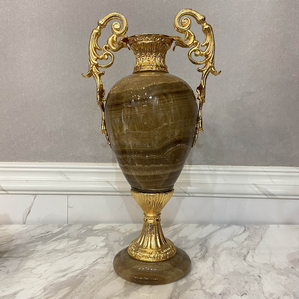 Bình đá cẩm thạch Pháp với họa tiết đồng mạ vàng 24K được chế tác từ khối cẩm thạch tự nhiên có tone màu nâu cùng các đường gân trắng mà thiên nhiên tạo nên qua hàng trăm năm. Các nhà thiết kế người Pháp đã sử dụng hoạ tiết hoa uốn nhẹ nhàng làm biểu tượng 2 bên quai bình nước mà các cô gái xưa hay ôm và hình ảnh đài hoa nâng đỡ toàn bộ thân bình bên trên.