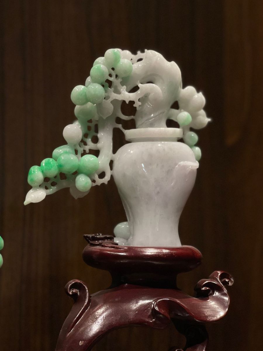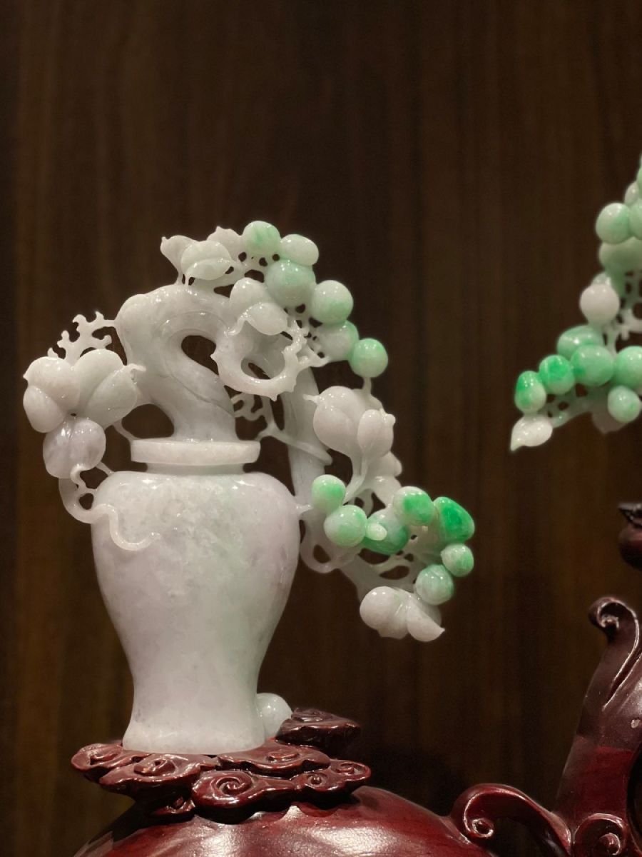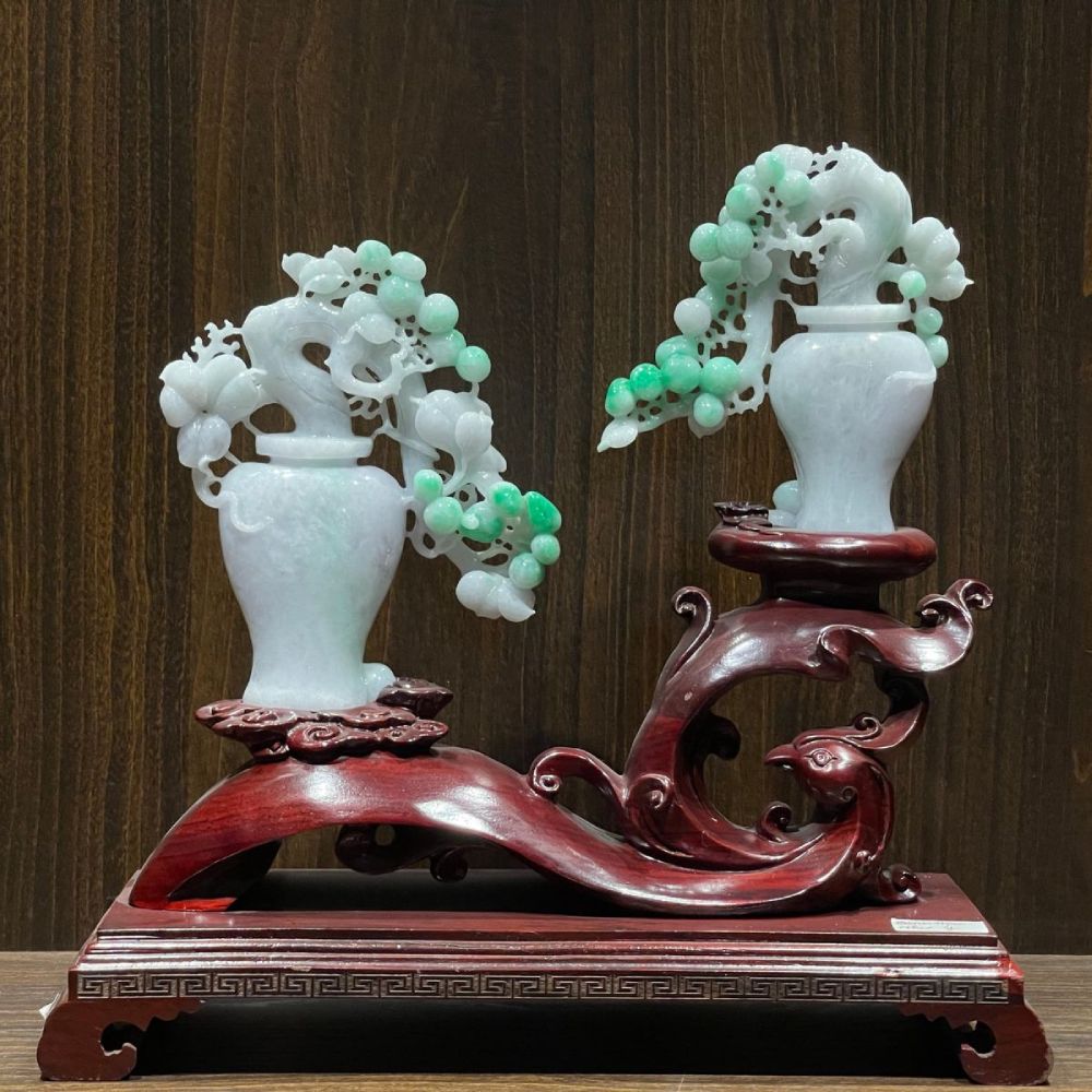 Một cặp bình hoa bằng ngọc phỉ thúy, hình ảnh cây hoa quả sum suê được chạm khắc vô cùng tỉ mỉ, tượng trưng cho một gia đình hạnh phúc, đuề huề con đàn cháu đống, tiền tài phúc lượng. Đế bằng gỗ