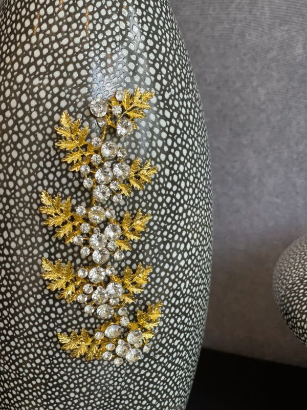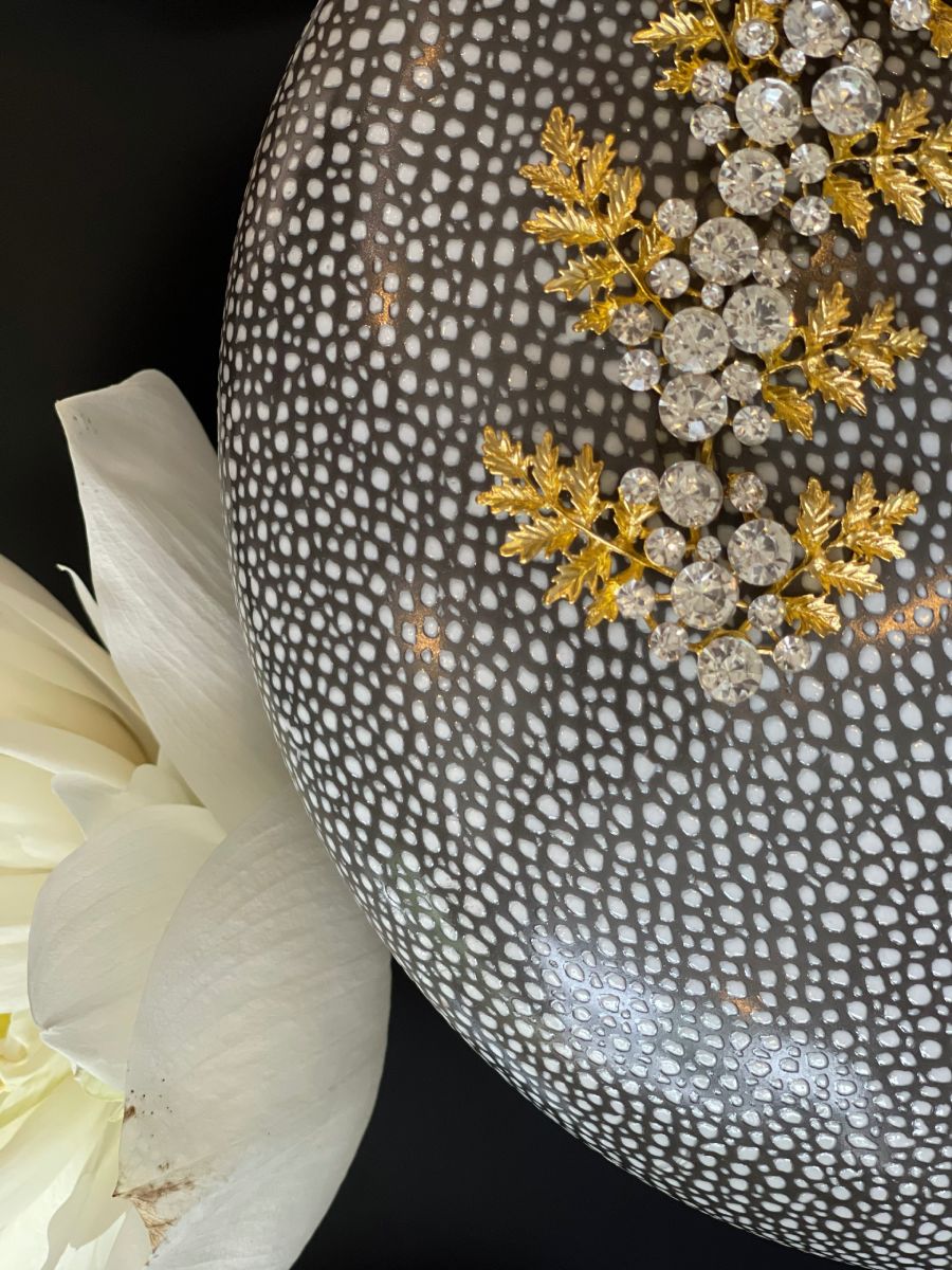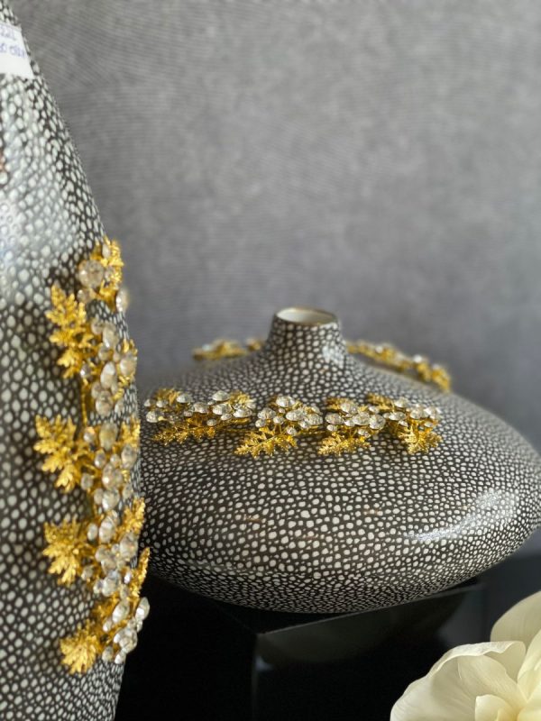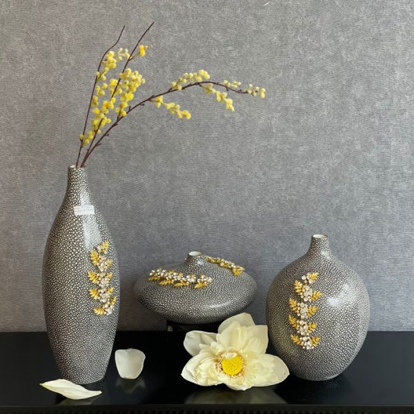 Bình hoa sứ trang trí được làm bằng sứ với các hình dáng bình khác nhau, thân bình có các hoạ tiết hình lá đính hạt cườm, thiết kế đơn giản nhưng vô cùng sang trọng và có thể cắm hoa hay decor các góc khác nhau tuỳ ý thích.