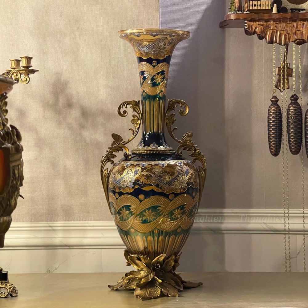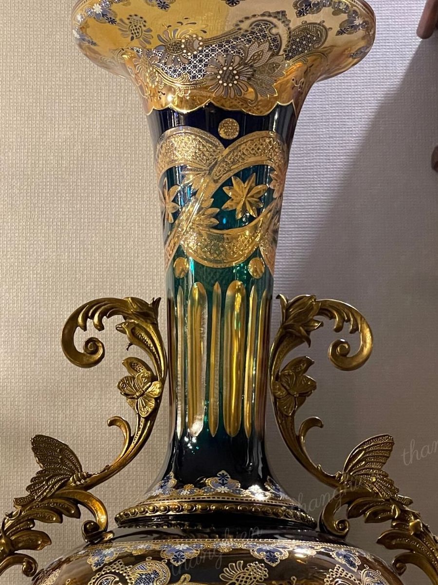 Bình pha lê vẽ vàng mang phong cách cổ điển, Bình được thiết kế điêu khắc nổi trên thân bình và kết hợp vẽ vàng toàn bộ. Chân đế là hoạ tiết những chiếc lá đan vào nhau bằng đồng mạ vàng.