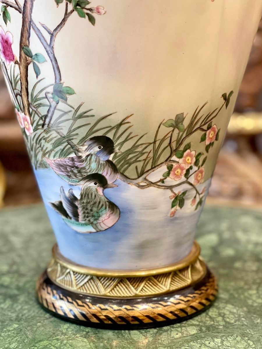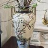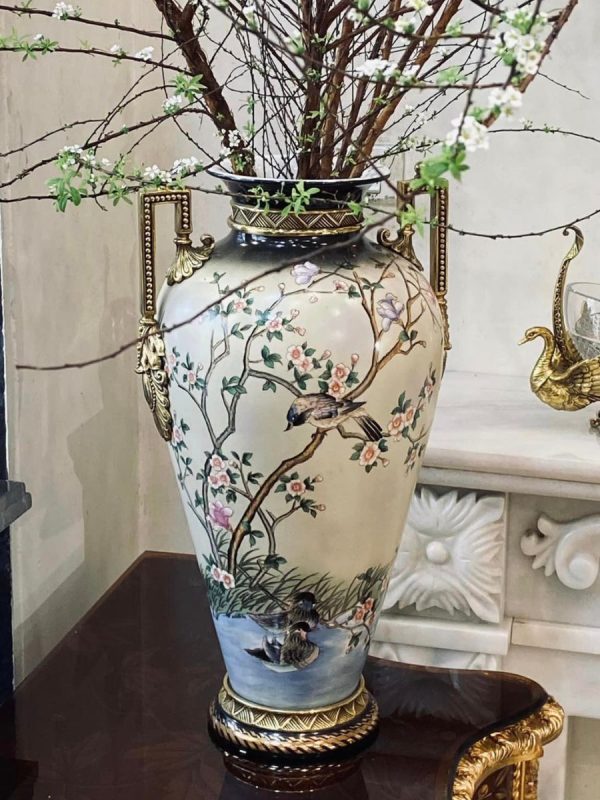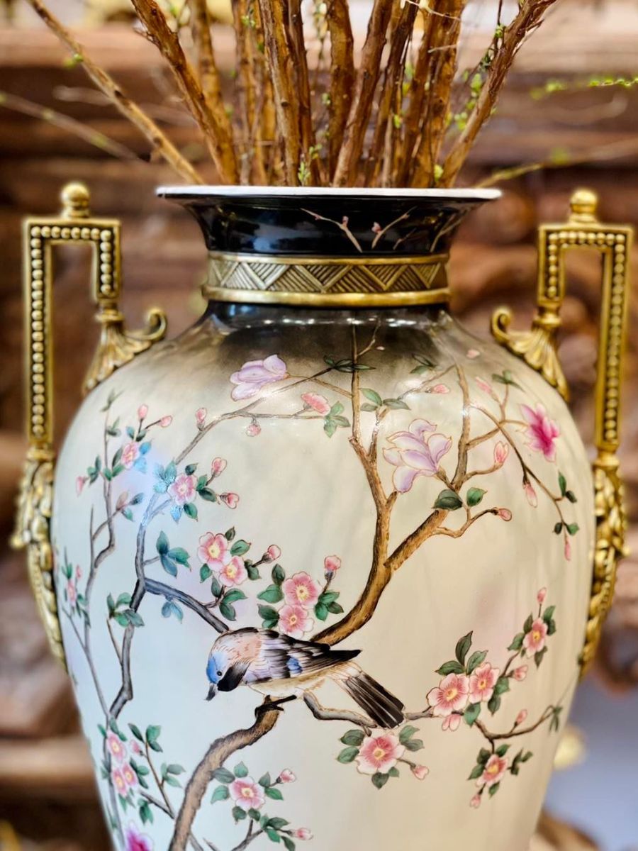 Bình được làm bằng sứ trên bề mặt thân bình vẽ hoạ tiết sơn mài hình ảnh những bông hoa đào và những chú chim trông cực bắt mắt.