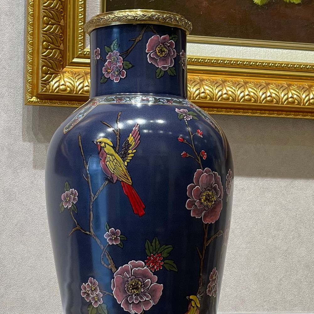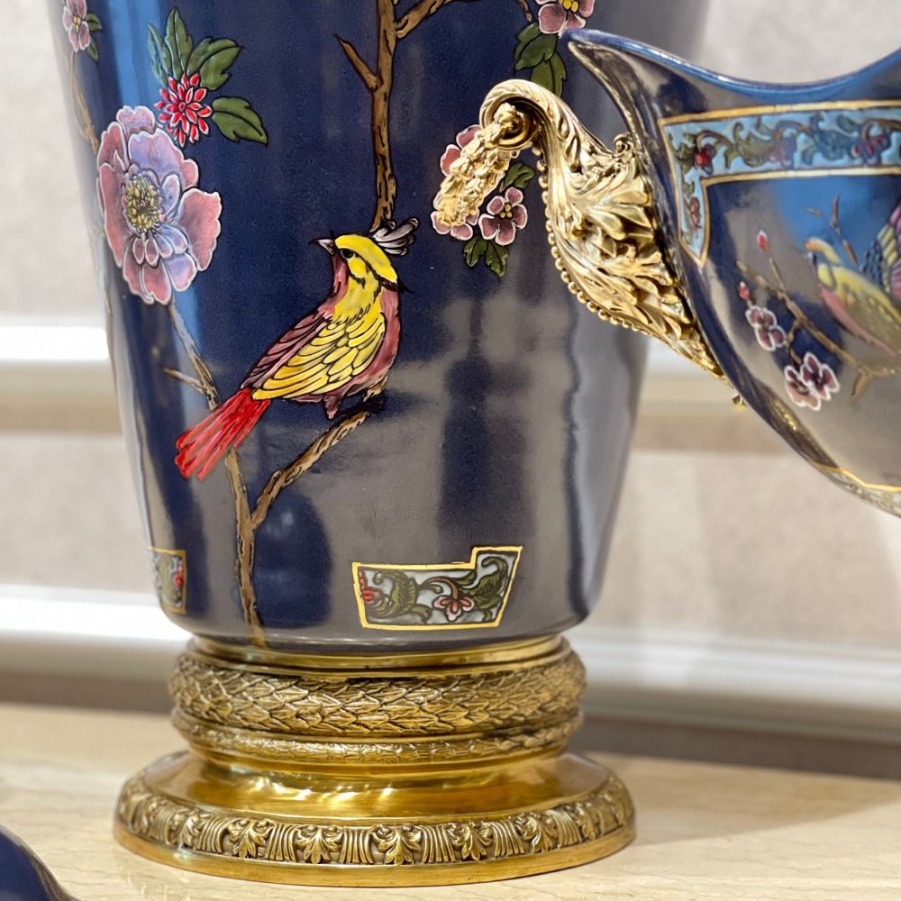 Bình sứ châu Âu màu xanh navy đậm là một tác phẩm nghệ thuật độc đáo và sang trọng. Bình được làm bằng sứ cao cấp với màu men xanh navy đậm bóng bẩy. Thân bình được trang trí với họa tiết hoa và chim được vẽ tay tinh xảo.