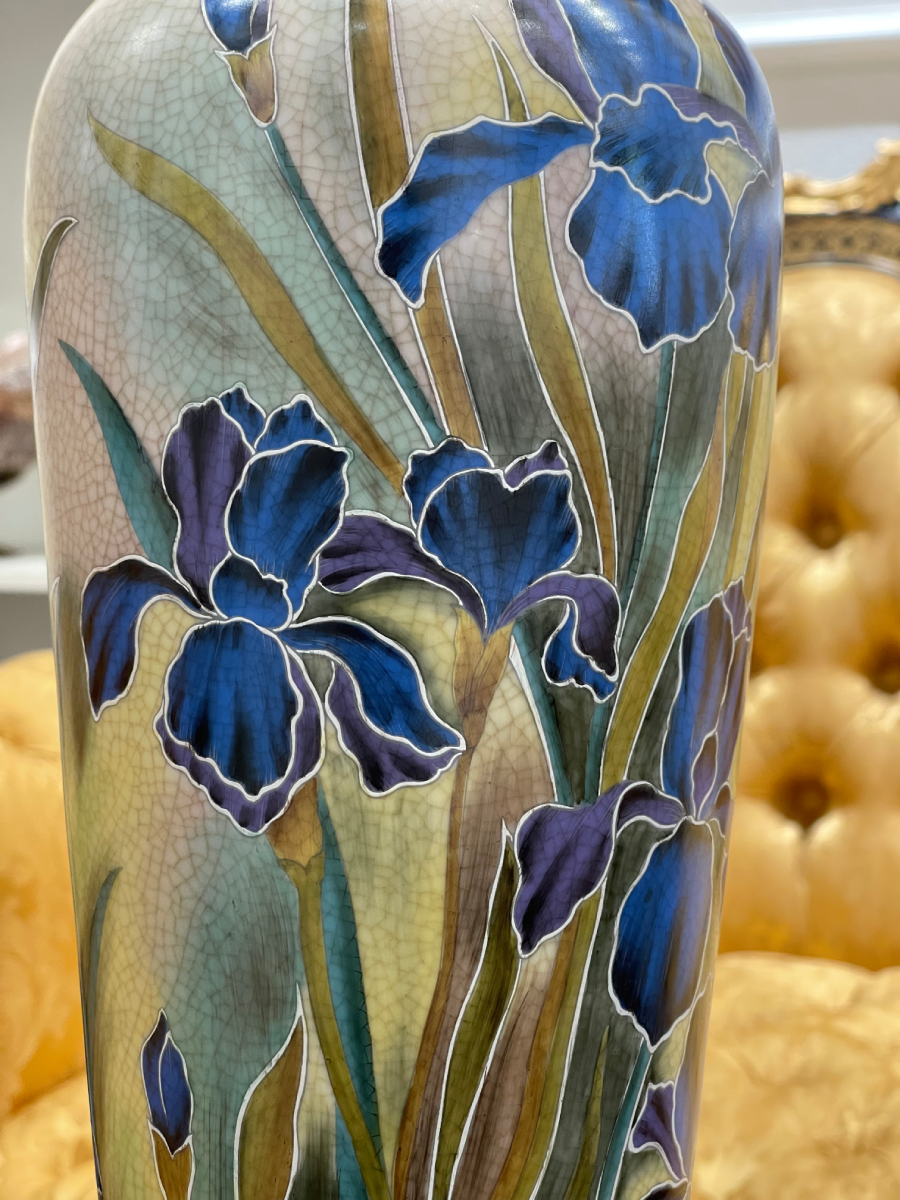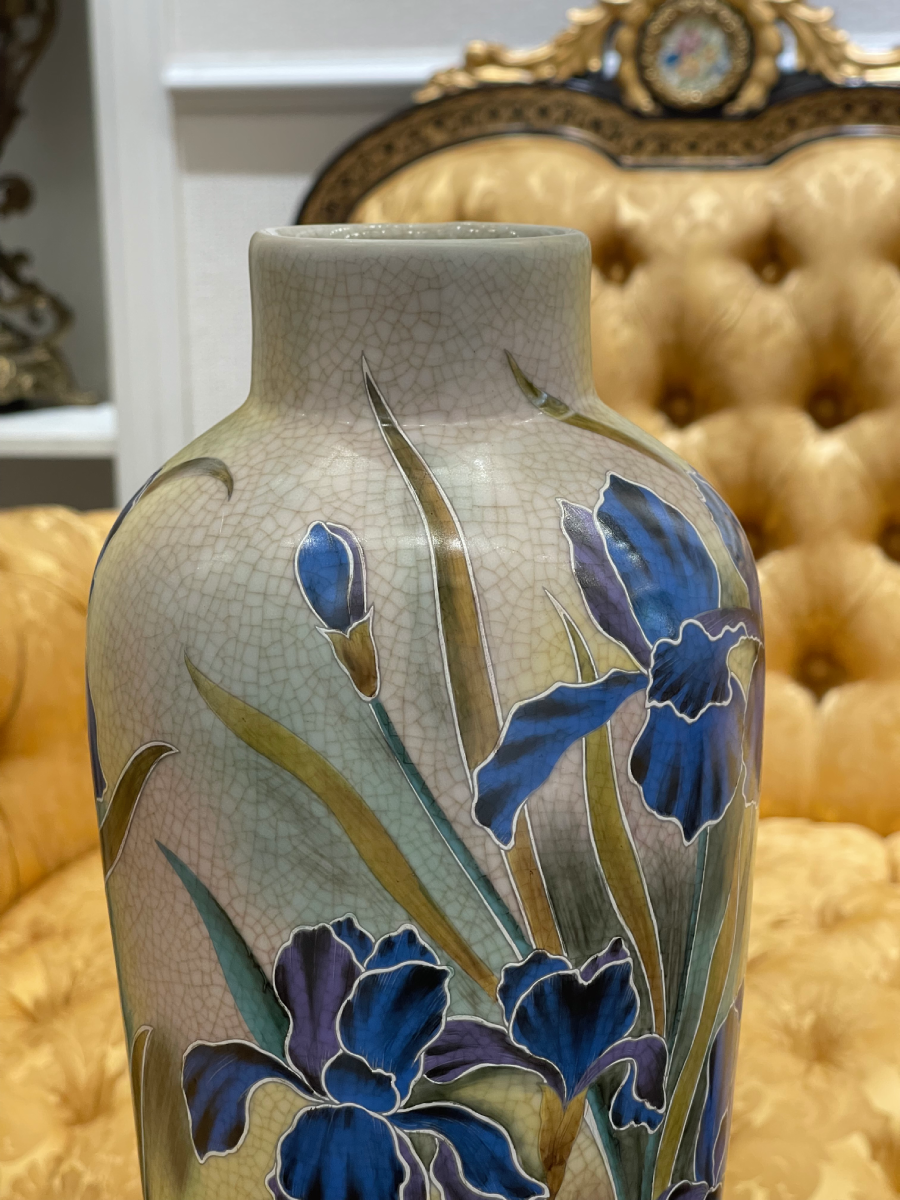 Bình sứ châu Âu trong ảnh có họa tiết hoa văn vẽ tay vườn hoa lris tinh xảo với hình ảnh hoa vàng rực rỡ nổi bật trên nền sứ trắng muốt. Hình ảnh hoa vàng tượng trưng cho sự may mắn, tài lộc và hạnh phúc, mang đến nguồn năng lượng tích cực cho không gian sống.