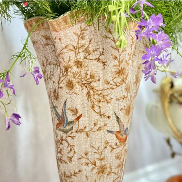Bình sứ chuồn chuồn được vẽ hoạ tiết hoa lá cành trên bề mặt, thiết kế to dần từ đế và xoè ra ở phần miệng bình. Đặc biết đế bình kết hợp hình ảnh những chú chuồn chuồn bằng đồng cực kỳ bắt mắt.