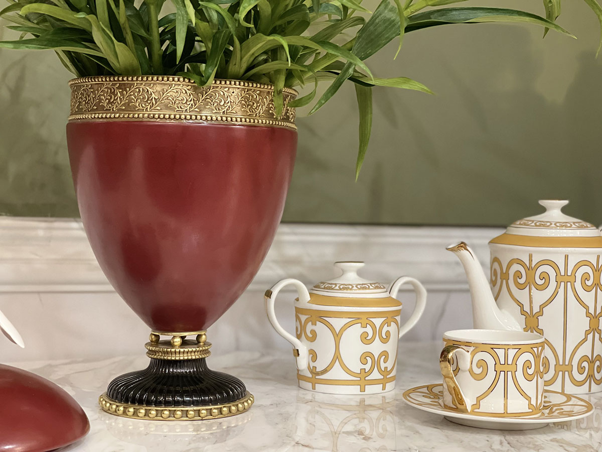 Xung quanh phần miệng có đồng bao quanh tăng thêm độ trang nhã, nổi bật. Những họa tiết lá được khắc nổi trên phần đồng với tone vàng làm điểm nhấn cho sản phẩm. Phần chân cũng bằng đồng màu đen và vàng xen kẽ. Màu sắc tưởng chừng đối lập nhưng lại hòa quyện với nhau.