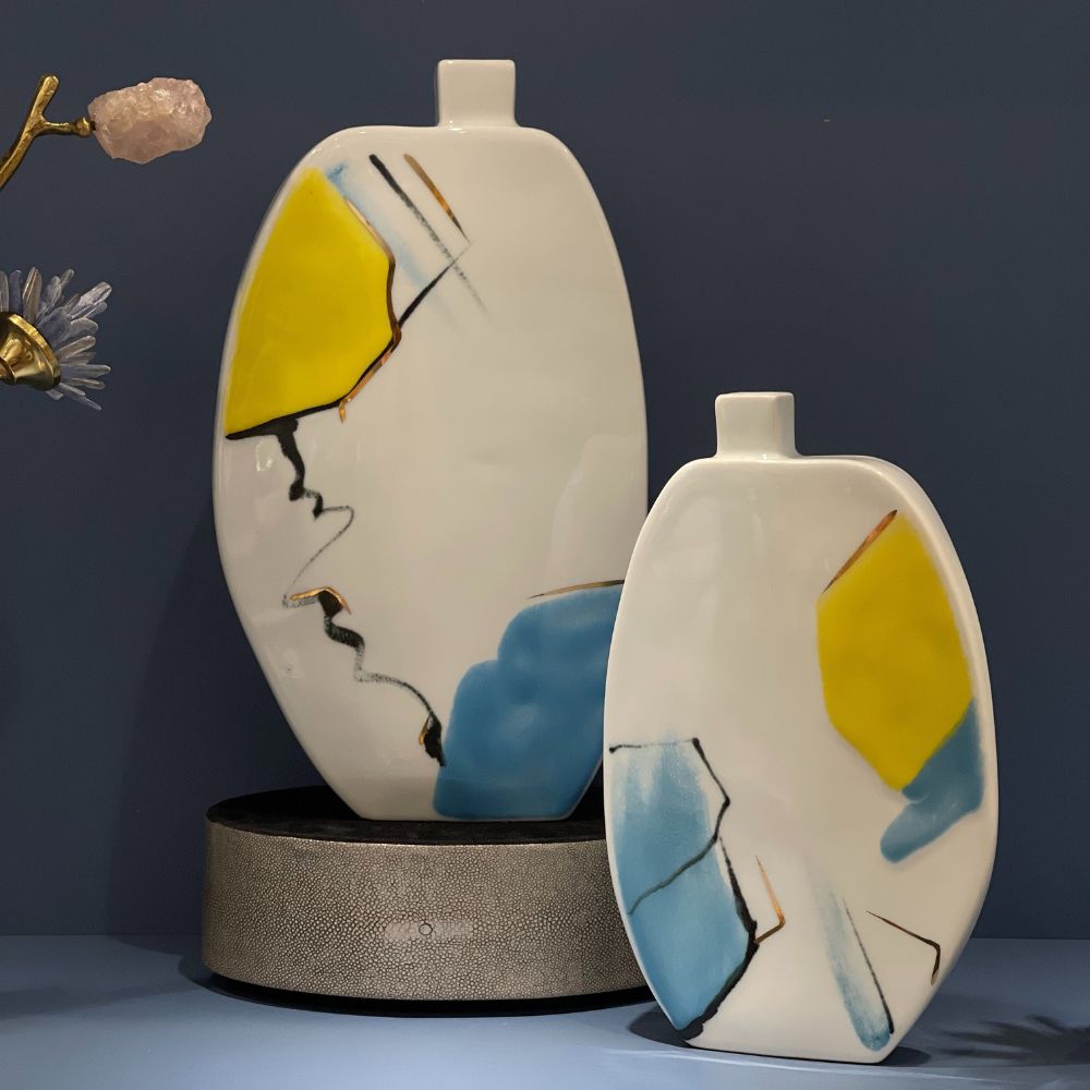 Bình sứ được thiết kế với kiểu dáng độc đáo và các màu sắc tươi sáng như vàng, xanh dương, và trắng, tạo nên một phong cách nghệ thuật hiện đại. Sự kết hợp giữa các khối hình và màu sắc không chỉ thu hút ánh nhìn mà còn mang đến cảm giác mới mẻ cho căn phòng.