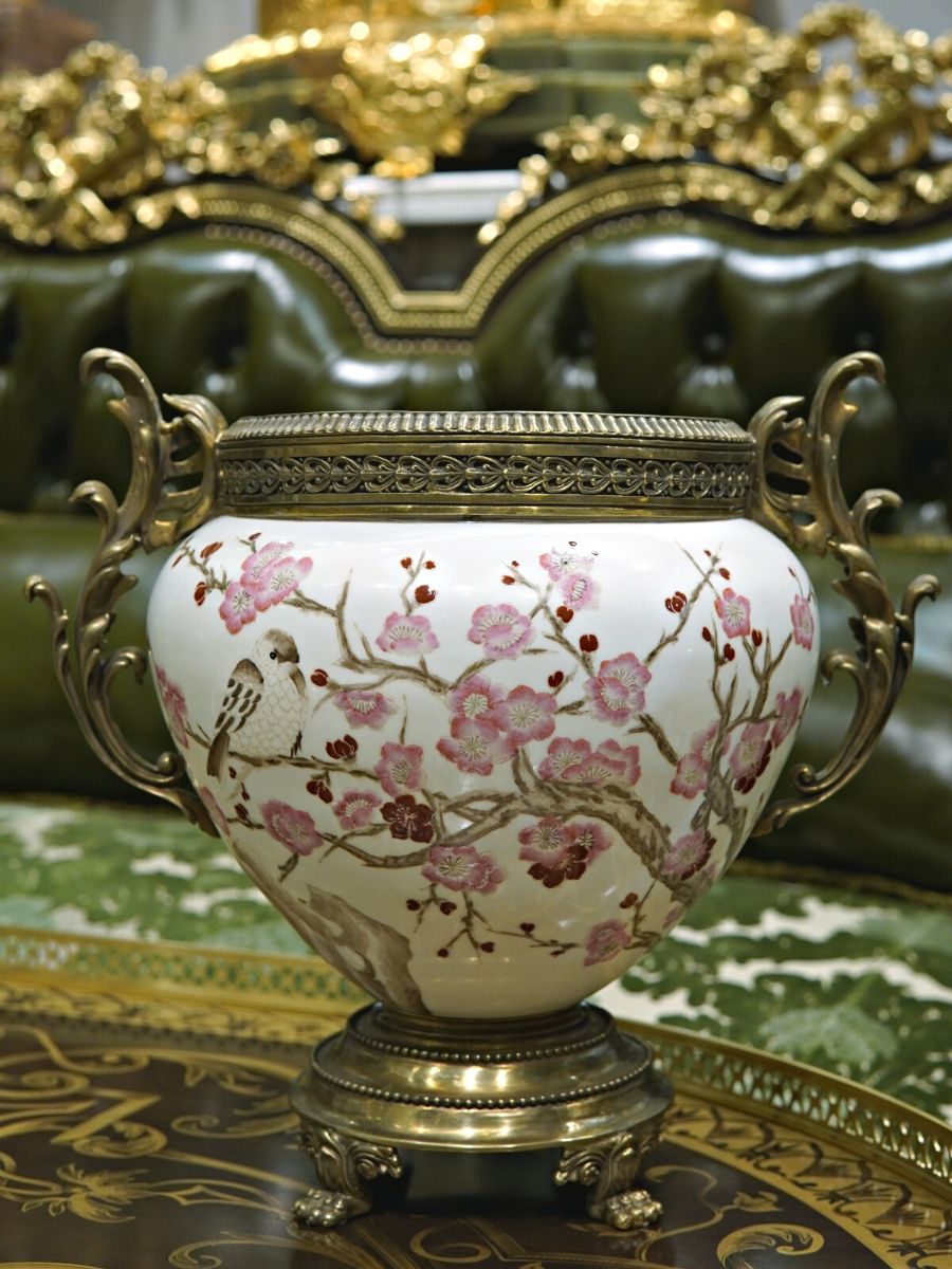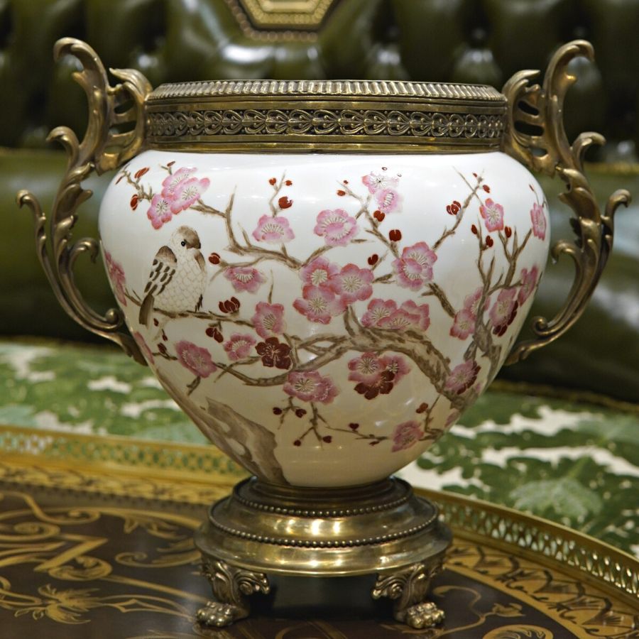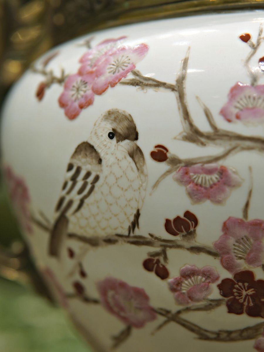 Bình sứ hoa đào được tạo bởi sứ, phần thân bình phình to nhỏ dần về dưới chân, được vẽ hoạ tiết hoa đào đỏ và chú chim vô cùng tỉ mỉ và bắt mắt. Hoạ tiết miệng bình và đế bằng đồng mạ vàng.