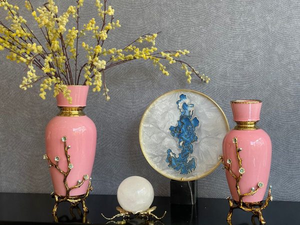 Bình sứ mùa xuân tone hồng được kết hợp hoạ tiết những nhành hoa sứ sắc màu như đang vui đùa đón chào mùa xuân.
