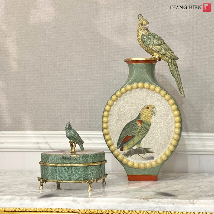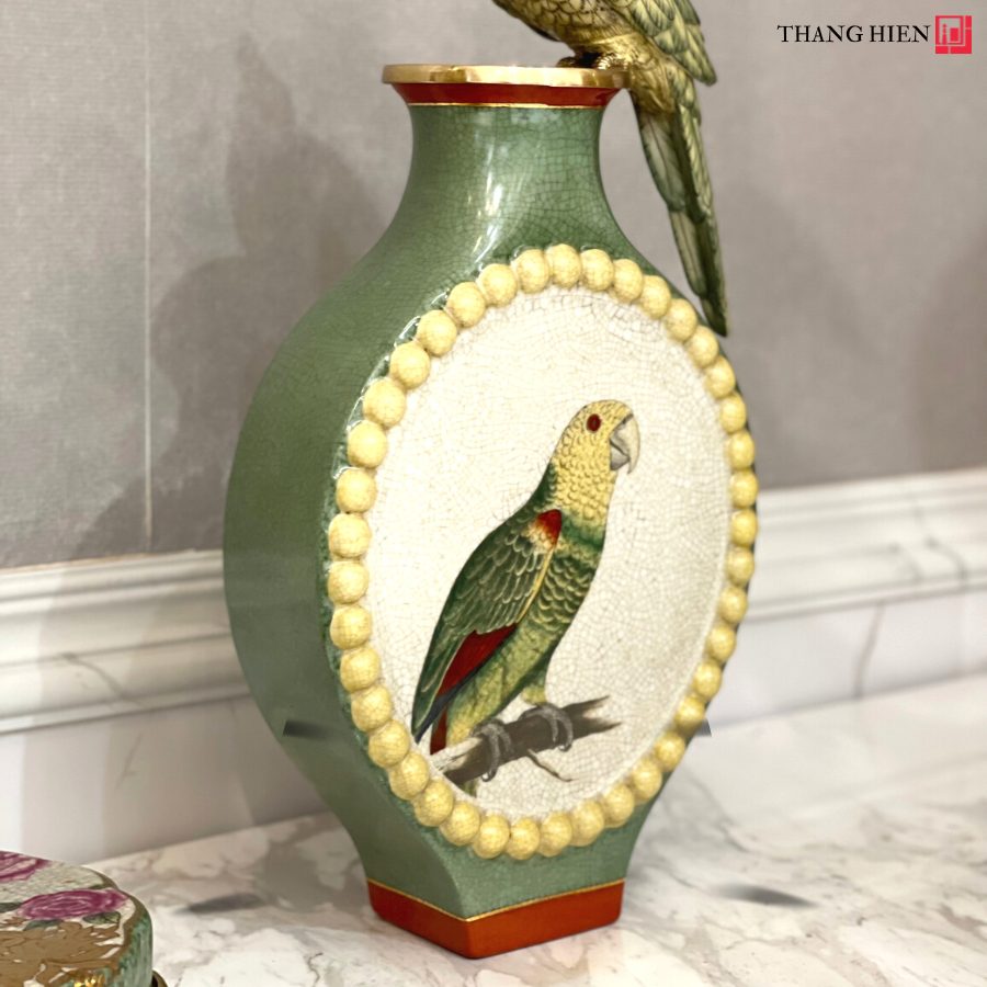 Bình sứ vẹt được tạo nên từ chất liệu sứ tone xanh pha chút trăng, trên bề mặt đặp nổi các hoạ tiết, Phần nổi bật nhất là hình ảnh chú vẹt bằng sứ đậu trên miệng bình.