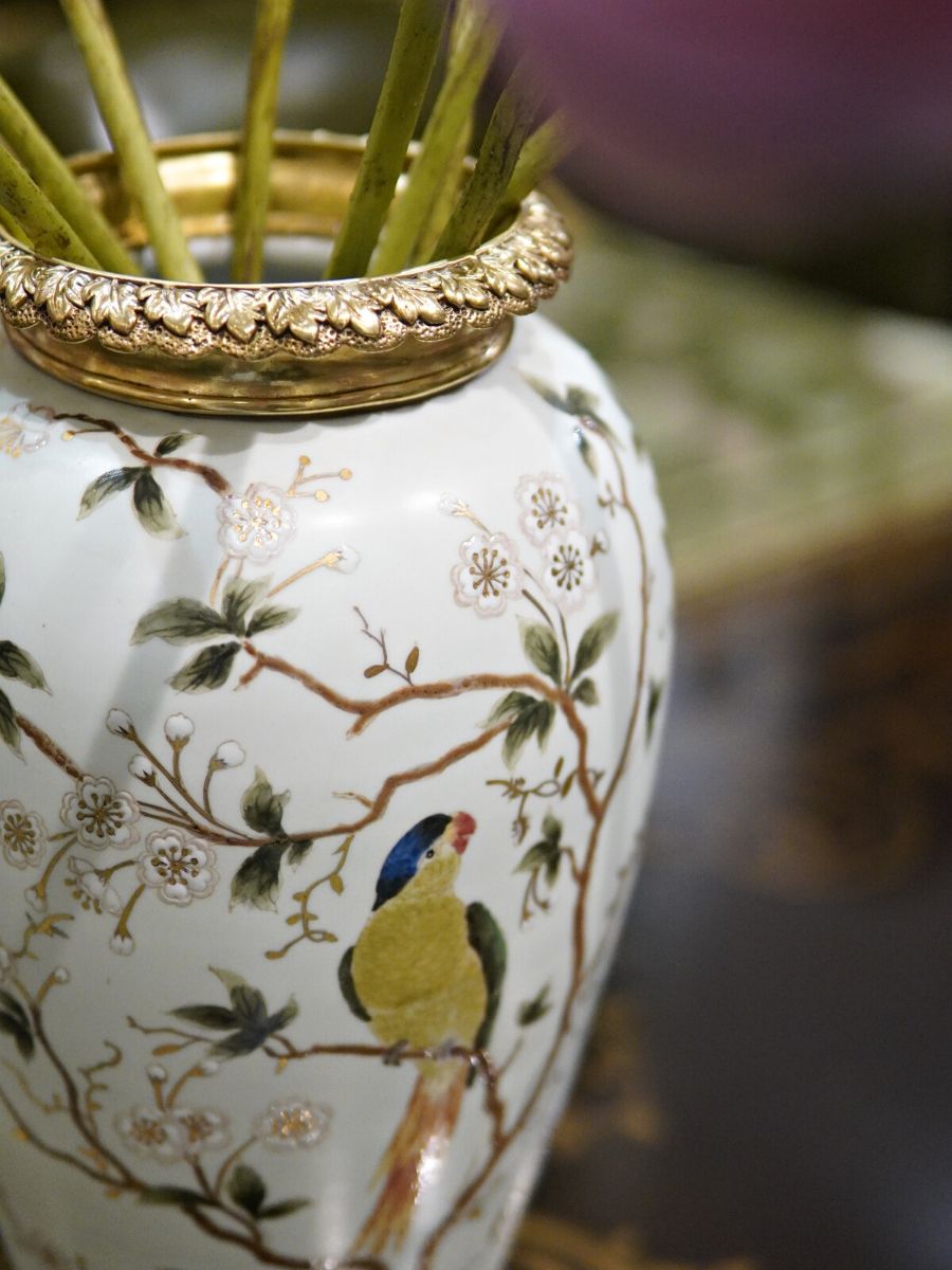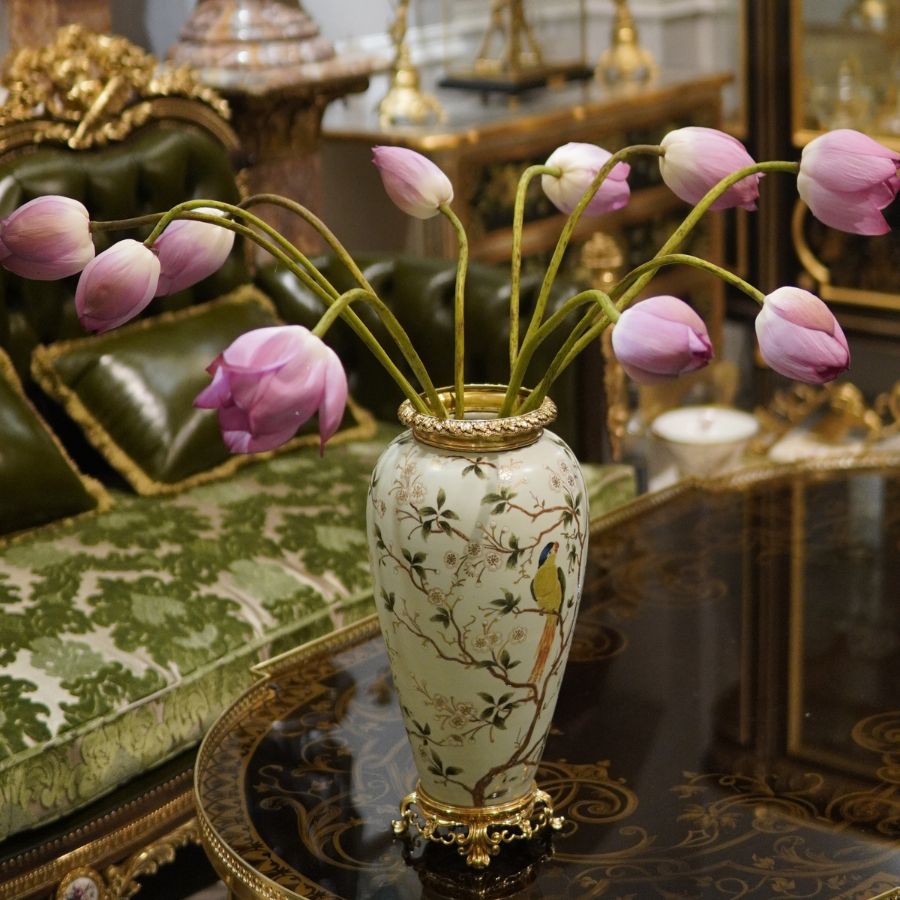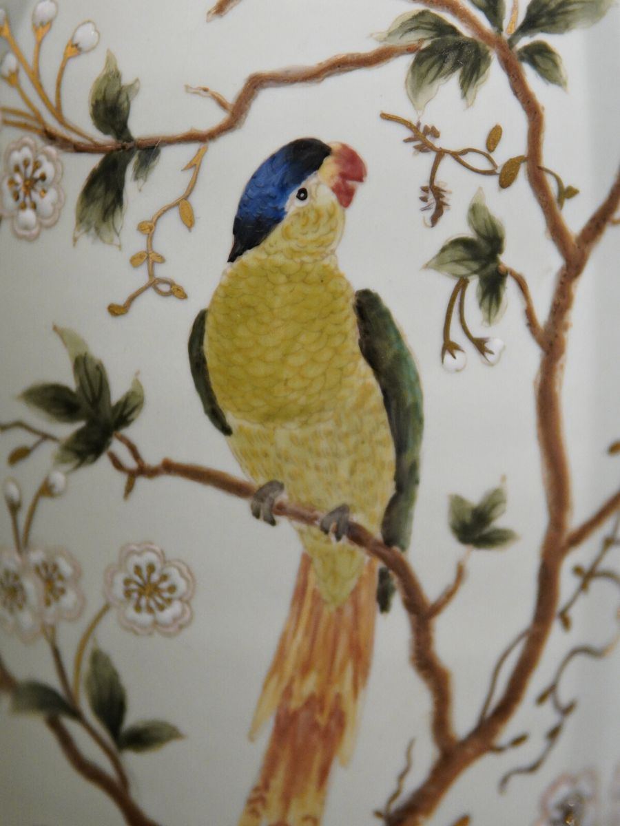 Bình sứ vẹt được tạo nên từ chất liệu sứ tone xanh , trên bề mặt được vẽ các hình ảnh hoa lá cành và chim vẹt vẽ thủ công sơn mài , Phần miệng và chân đế được kết hợp hoạ tiết đồng vàng.