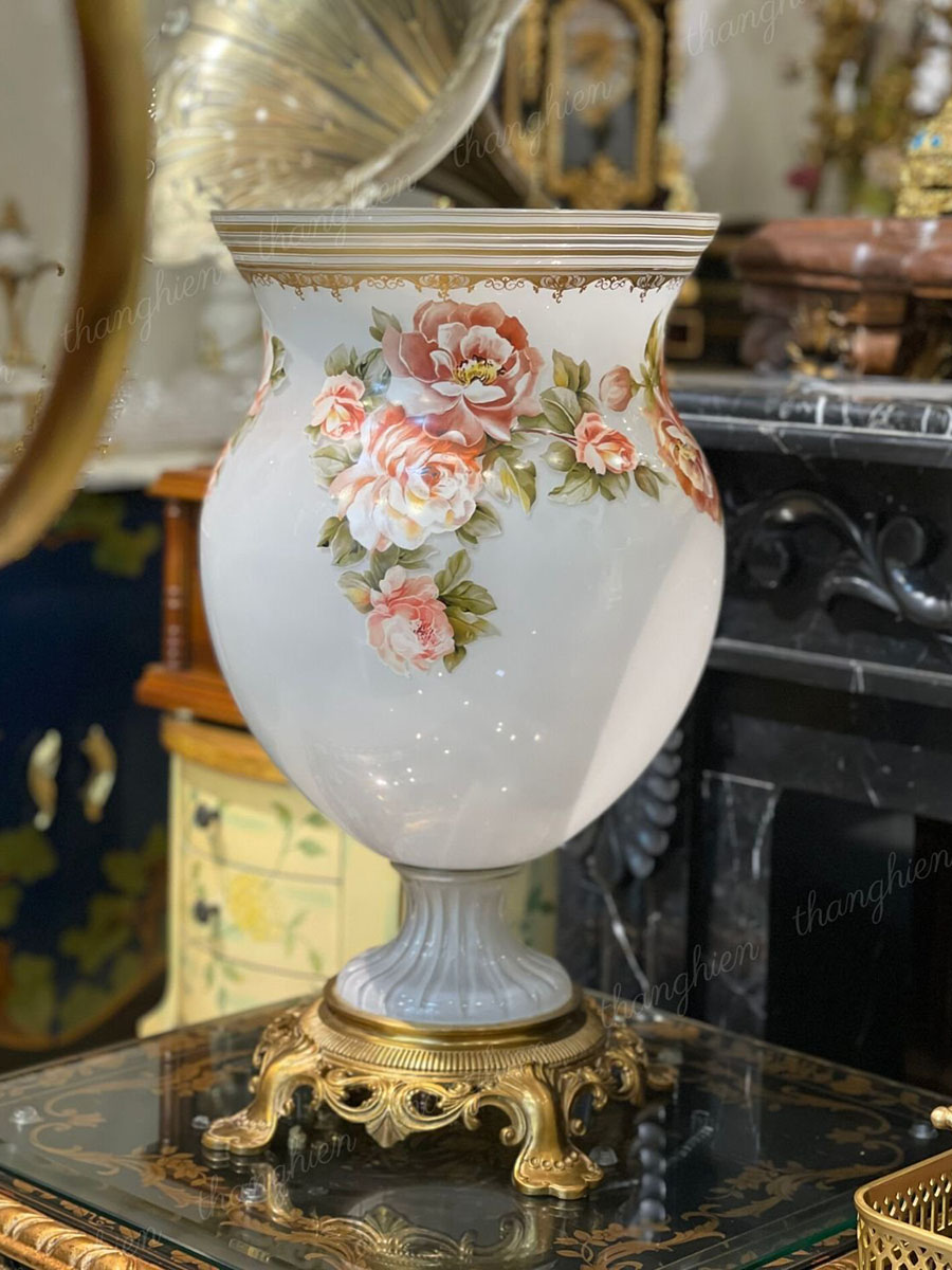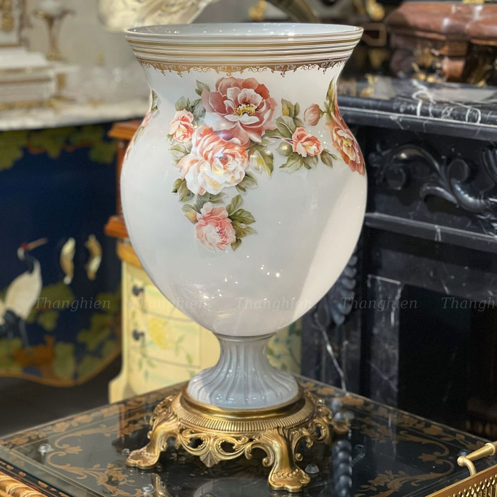 Bình thủy tinh tone trắng sứ với đường kính lớn có thể trang trí trên bàn, kệ hay cắm hoa để các sảnh lớn hoặc làm món quà tặng đầy ý nghĩa