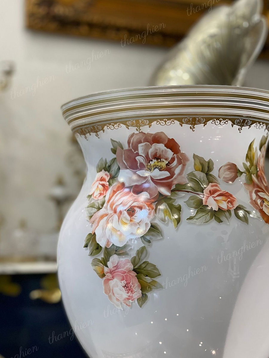Các khóm hoa hồng đỏ, trắng vẽ quanh miệng bình tăng thêm độ sinh động , uyển chuyển, mềm mại của nét uốn cong của thân bình. Chân bình bằng đồng giống như chiếc đài hoa nâng đỡ, ôm ấp những khóm hoa hồng.