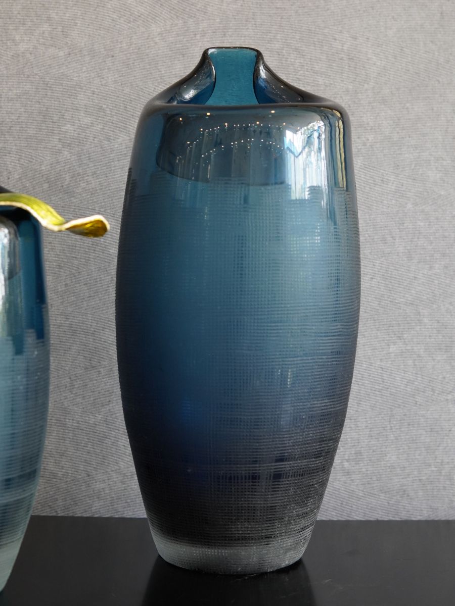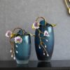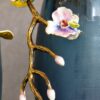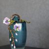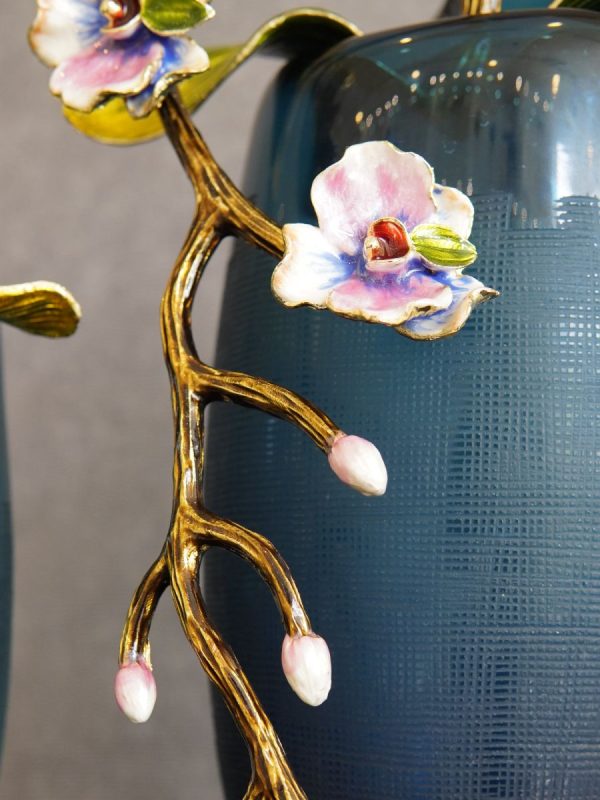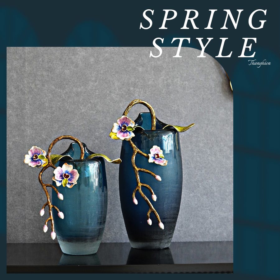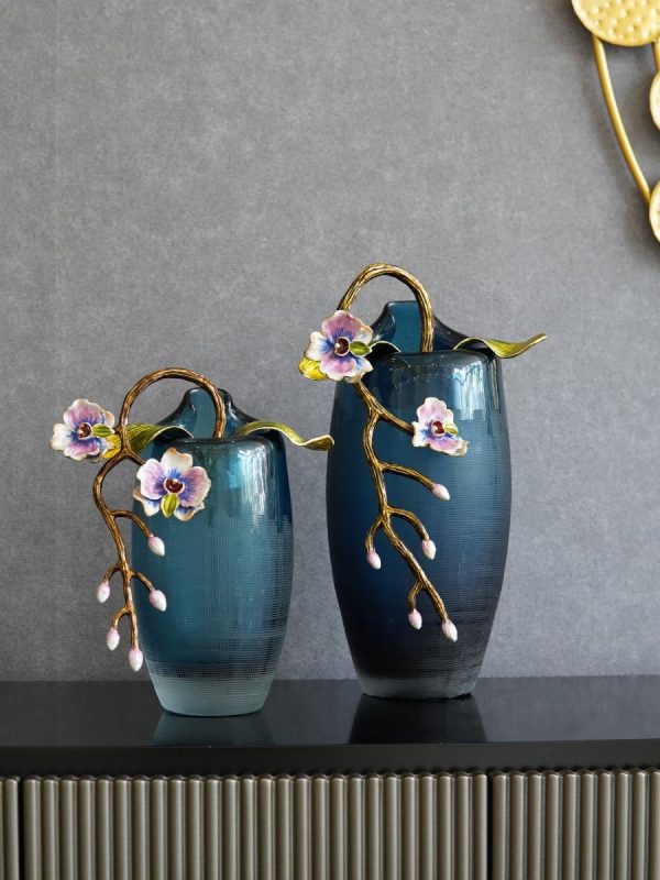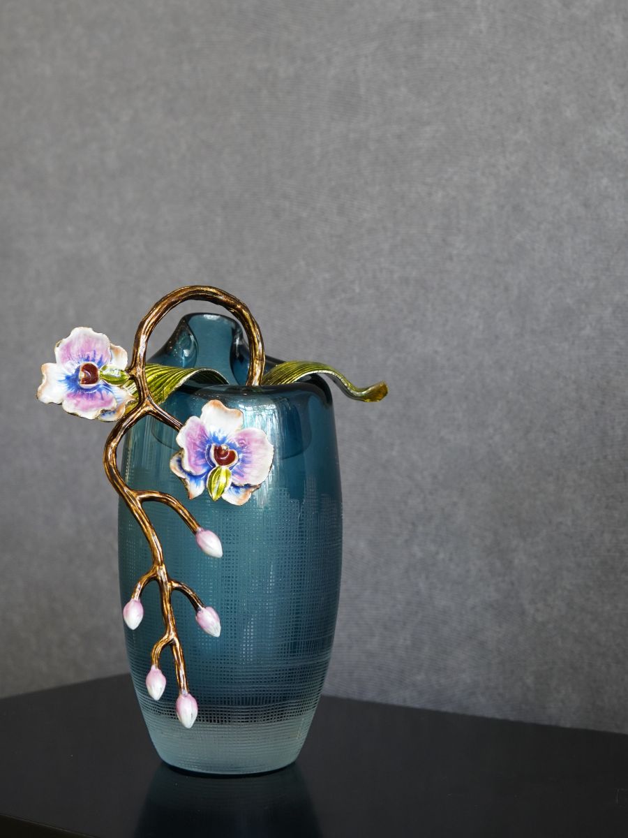 Bình thuỷ tinh hoa lan tone màu xanh với bông hoa lan được làm bằng sứ đắp nổi tạo điểm nhấn cho sản phẩm.