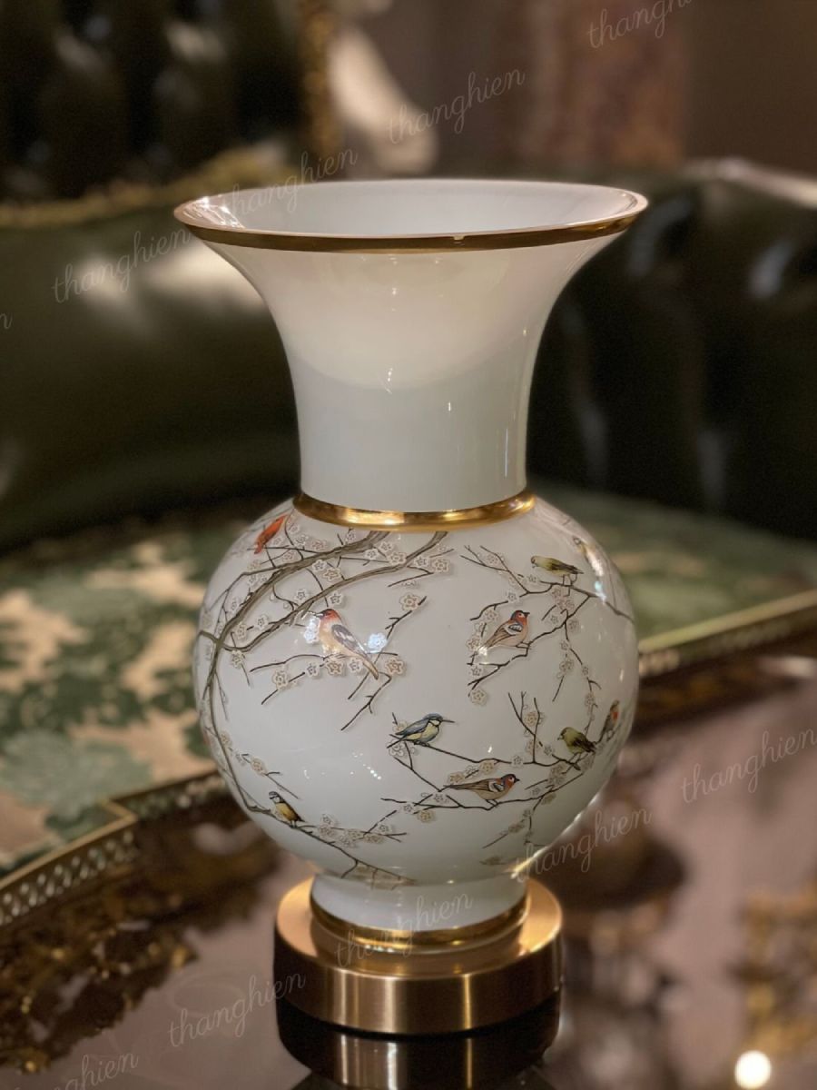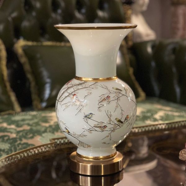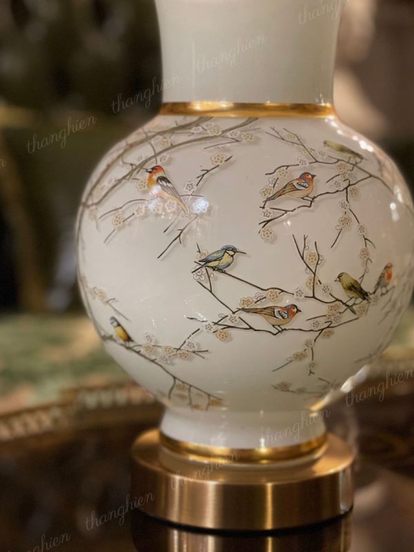 Trên thân bình vẽ bức tranh thiên nhiên rừng nhiệt đới với hình ảnh chú chim lông sắc màu rực rỡ cùng những nhành hoa vẽ vàng và màu xanh mát của rừng cây khiến cho đây không chỉ là một chiếc bình trang trí mà còn là tác phẩm nghệ thuật sống động.
