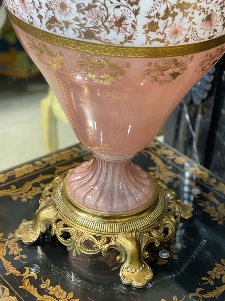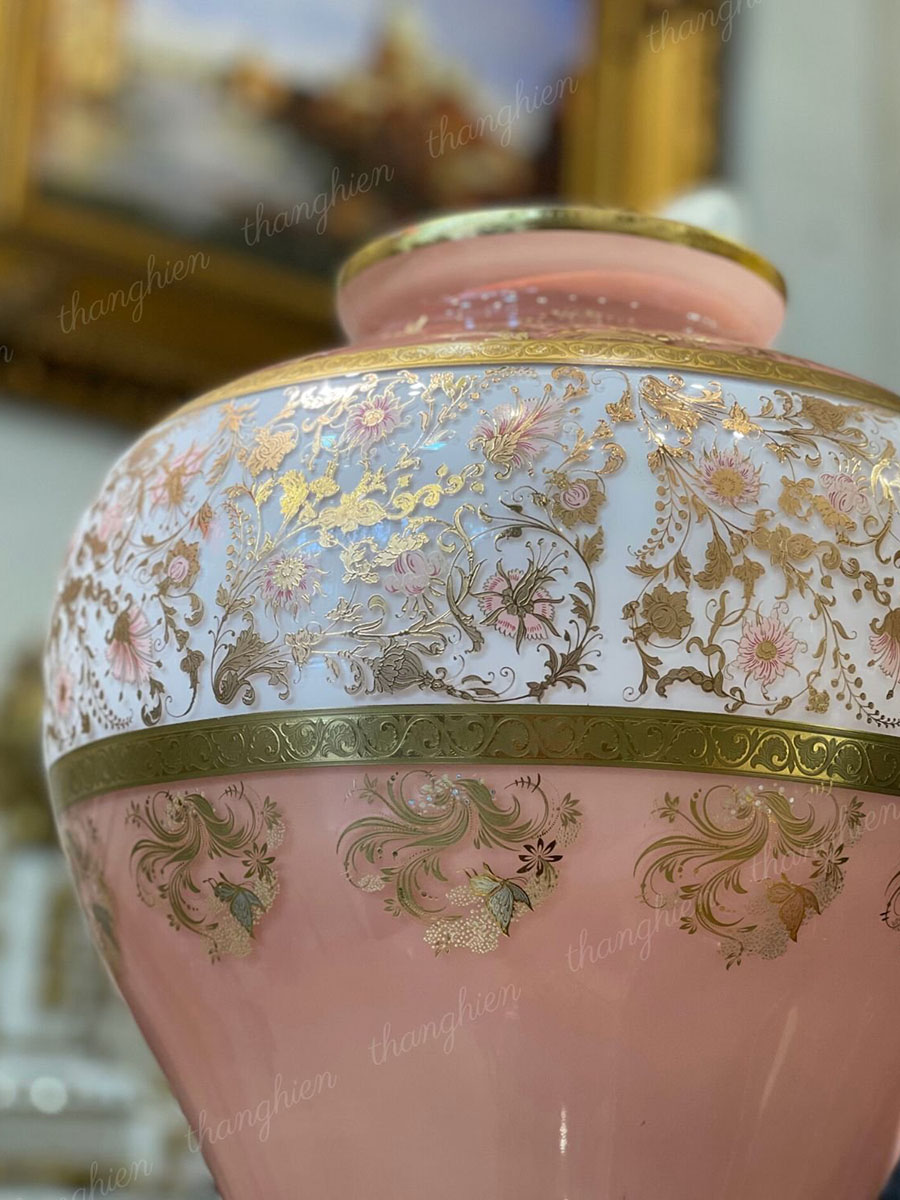 Trên thân bình vẽ vườn hoa lá đan xen nhau với các chi tiết được mạ vàng. Bình có ba cái với màu giống nhau nhưng thiết kế khác nhau để đặt ở vị trí rộng hay đối xứng tùy thuộc không gian.
