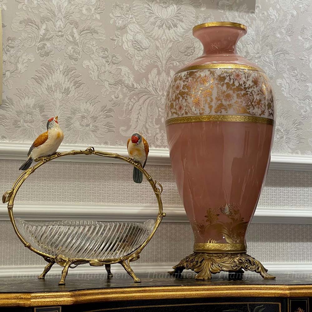 Trên thân bình vẽ vườn hoa lá đan xen nhau với các chi tiết được mạ vàng. Bình có ba cái với màu giống nhau nhưng thiết kế khác nhau để đặt ở vị trí rộng hay đối xứng tùy thuộc không gian.