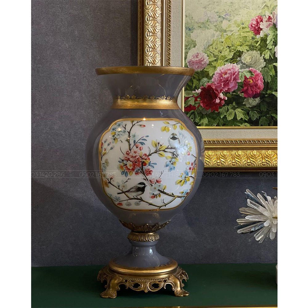 Trên thân bình vẽ đôi chim họa mi với cành hoa xuân đỏ trắng nở rực rỡ, ấm áp và những đường viền vàng quanh miệng, điểm uốn cong thân bình cùng họa tiết đồng ở phần chân bình giống như đài hoa đan ôm lấy bông hoa nở rộ cùng những chi tiết lá đồng xung quanh để tăng thêm độ vững chãi.