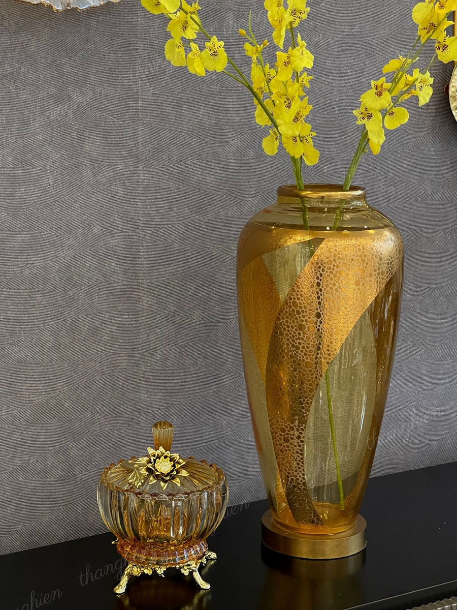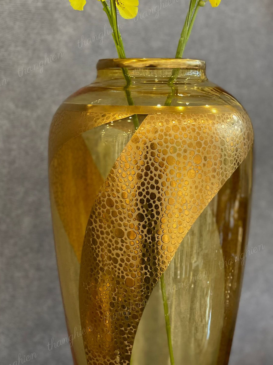 Bình thủy tinh vẽ vàng với thiết kế đơn giản có thể trang trí trên bàn, kệ hay món quà tặng đầy ý nghĩa