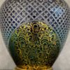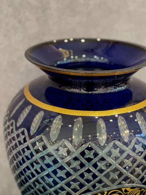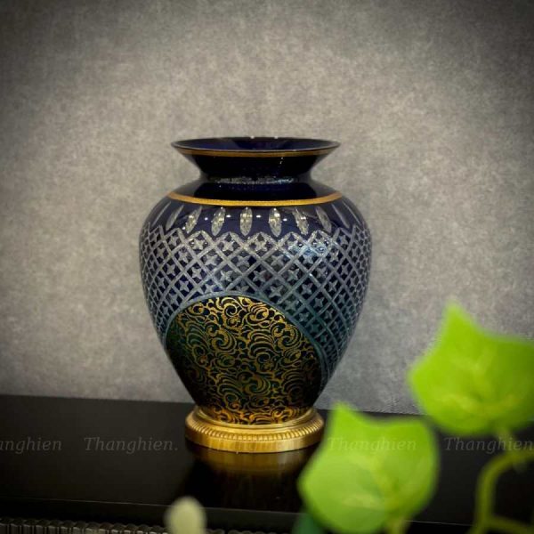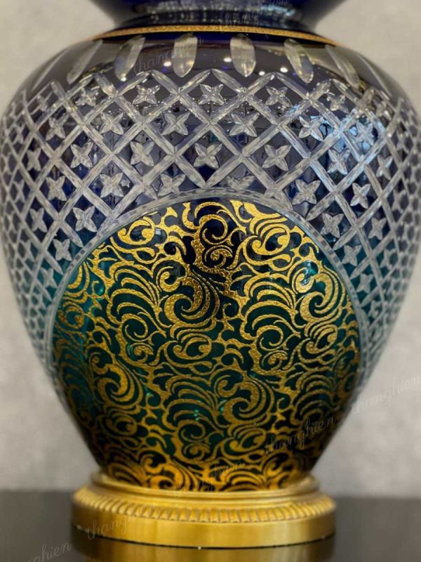 Bình thủy tinh xanh với hình ảnh giọt nước, hoa được khắc sâu trên toàn bộ thân bình cùng bột vàng để sử dụng vẽ hình ảnh ” trăm hoa đua nở” tạo cảm giác đẹp lạ mắt và là sản phẩm đơn chiếc. Chân bình bọc đồng thể hiện sự tỉ mỉ, chăm chút đến từng đường nét để cho sản phẩm hoàn hảo nhất
