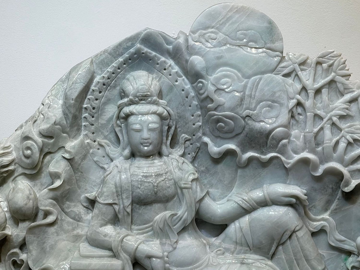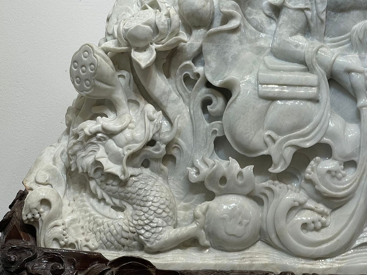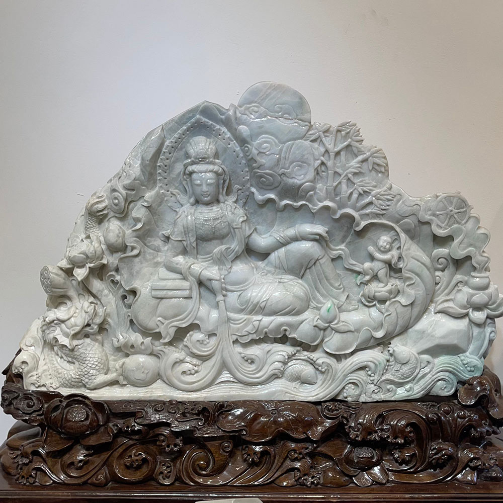 Tượng Bồ Tát Quan Thế Âm và cá chép hóa rồng là sự kết hợp hoàn hảo giữ hào quang nhà Phật với linh vật quyền năng, mang lại nhiều may mắn, an khang, phát tài phát lộc cho gia chủ. Tay Bồ Tát đỡ lấy bình ngọc đổ nước Cam lộ xuống trần để dập tắt lửa lòng chúng sinh trong dương thế, thoát khỏi cuộc sống đau khổ.