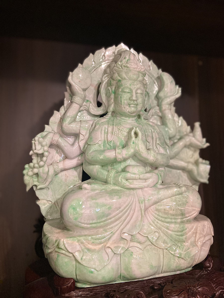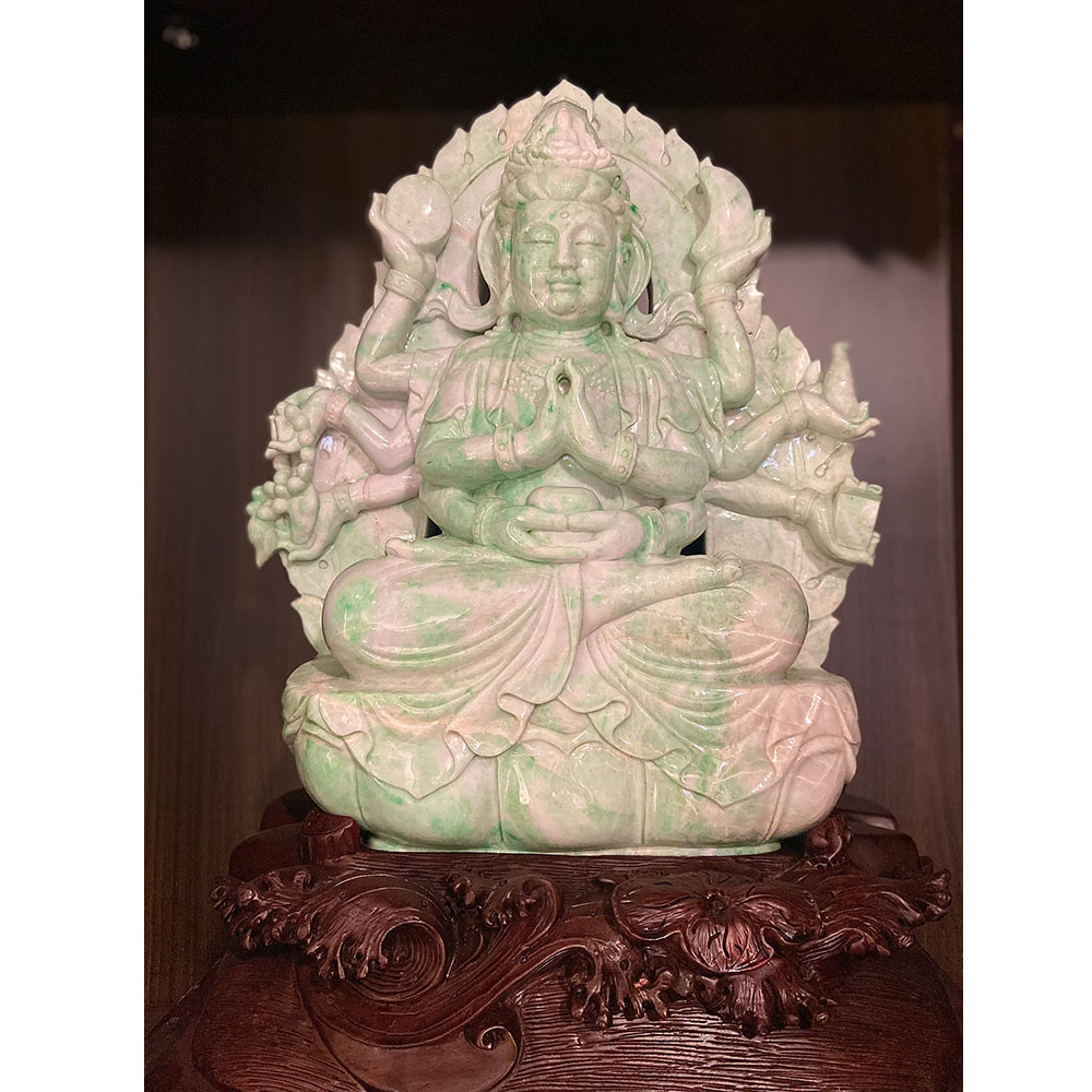 Bồ Tát Thiên Thủ Thiên Nhãn bằng ngọc ngồi trên đài sen gỗ