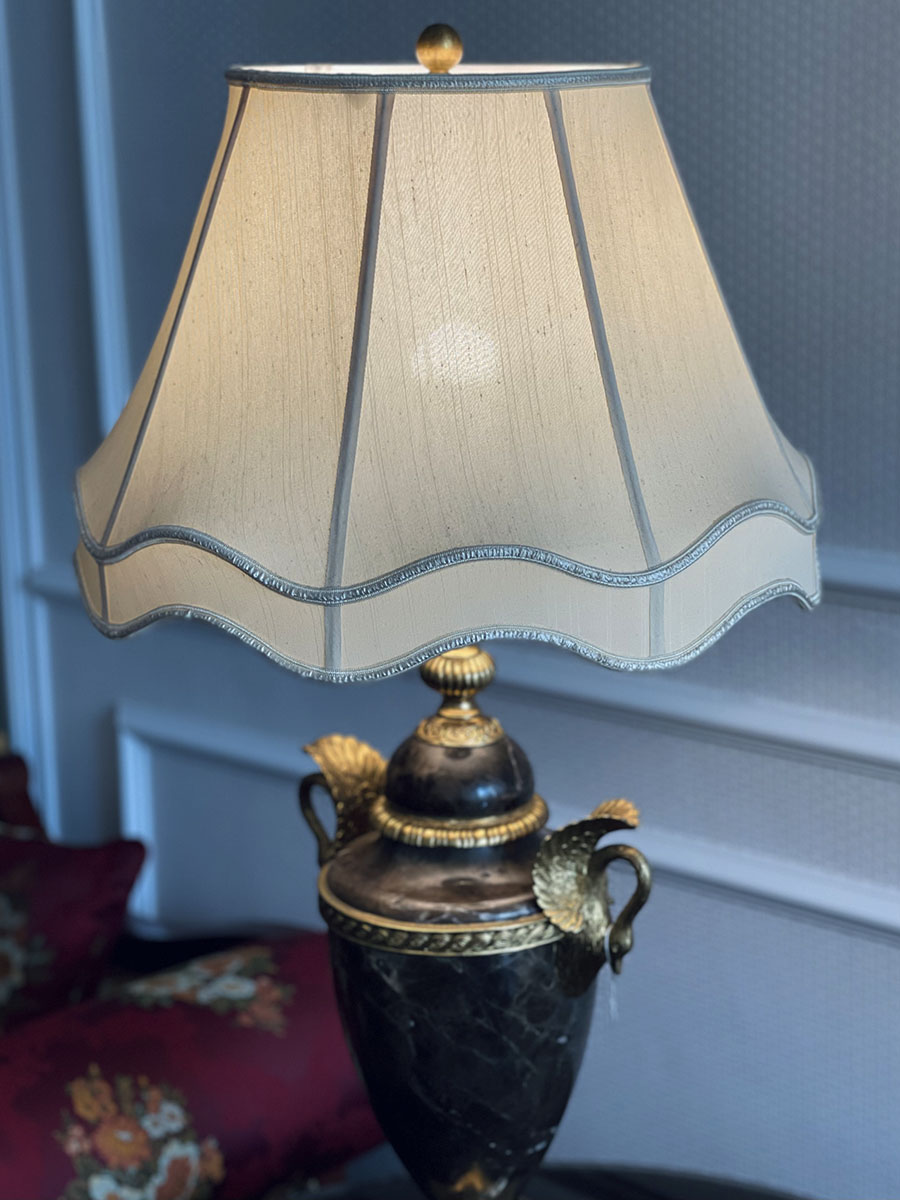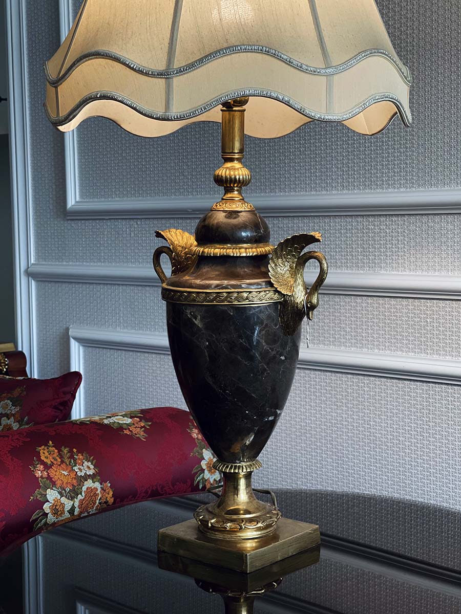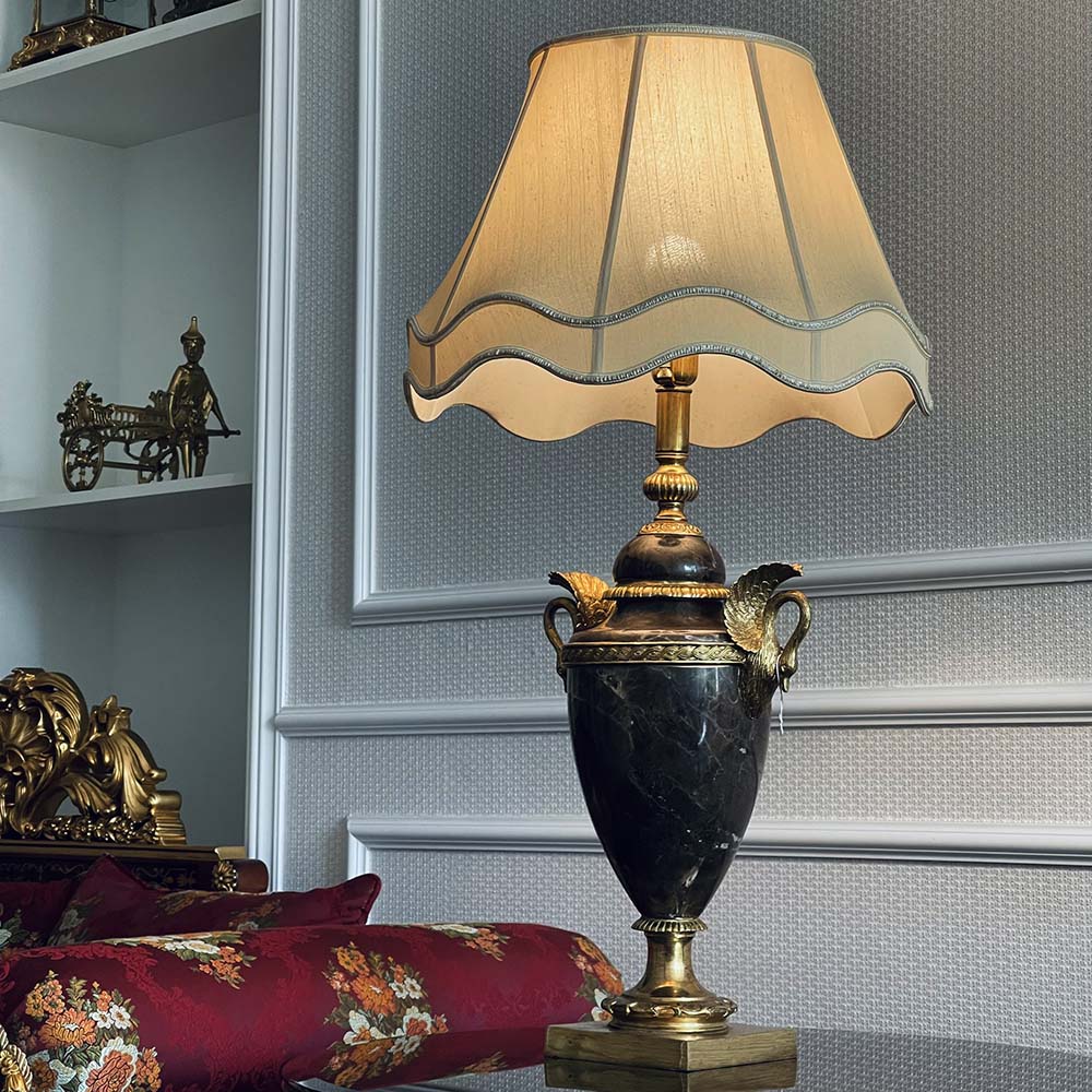 Được làm từ đá cẩm thạch đen với hình ảnh đôi thiên nga gắn hai bên thân đèn tạo nên điểm nhấn sang trọng, mềm mại, sức hút cho sản phẩm. Vân đá trắng của khối đá chạy dọc thân và cổ đèn giống như bức tranh trừu tượng đầy sáng tạo của thiên nhiên. Chân đèn là khối đồng trụ đơn giản càng tôn lên vẻ đẹp khối đá, sự phối màu hài hòa đầy ấn tượng.
