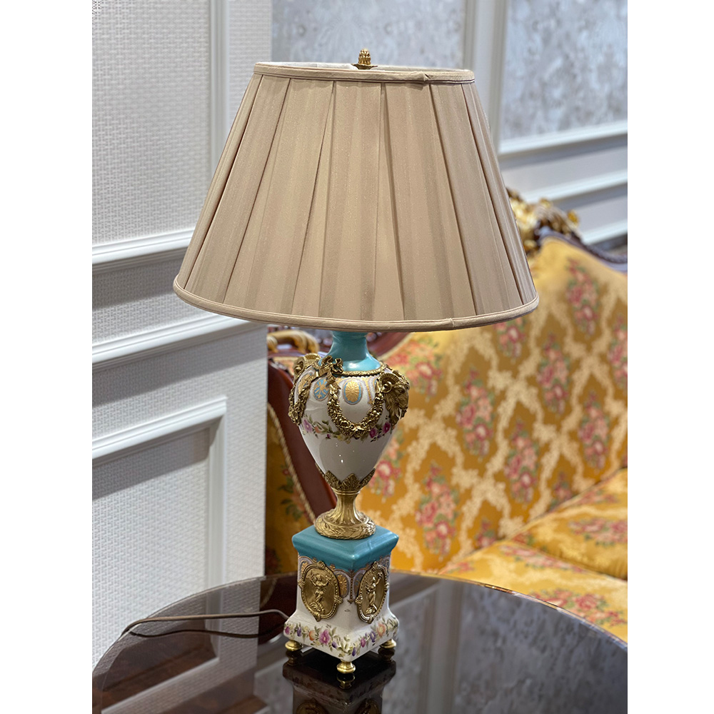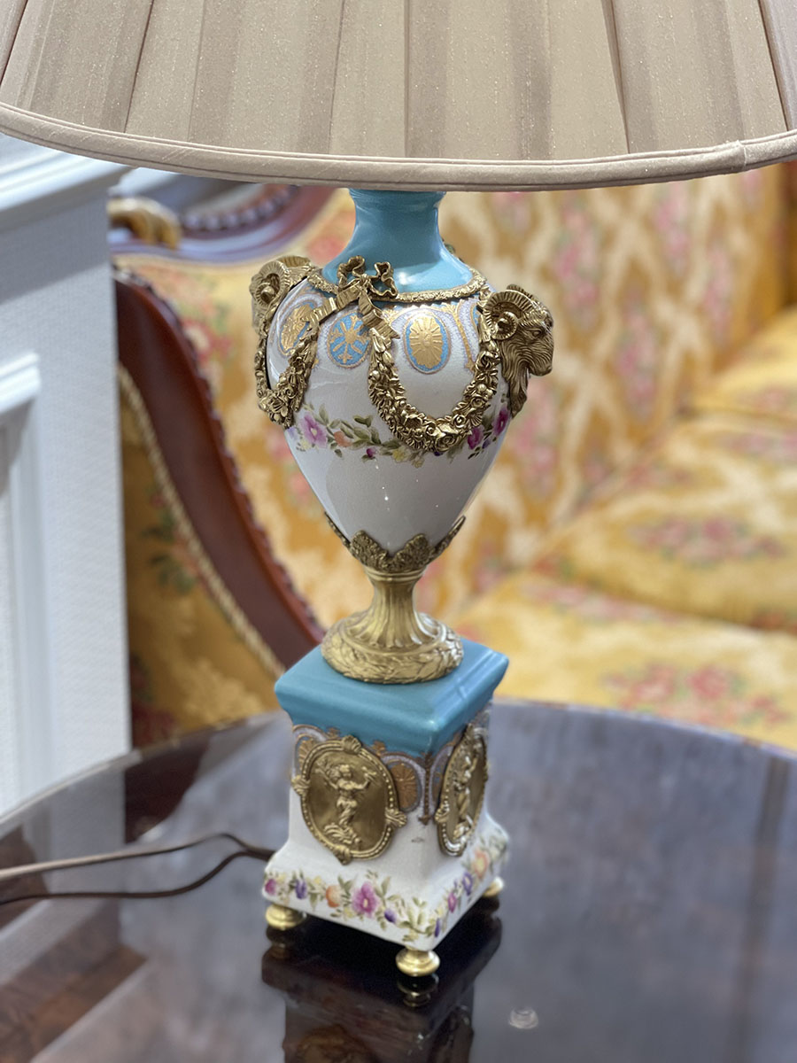 Đèn bàn sứ tone trắng xanh với họa tiết hoa vẽ xung quanh cùng hoa văn đồng hình hoa hồng cùng hai đầu linh dương điểm nối giữa các dải hoa phong cách tân cổ điển có thể trang trí ở các sảnh, góc, … hay quà tặng ý nghĩa