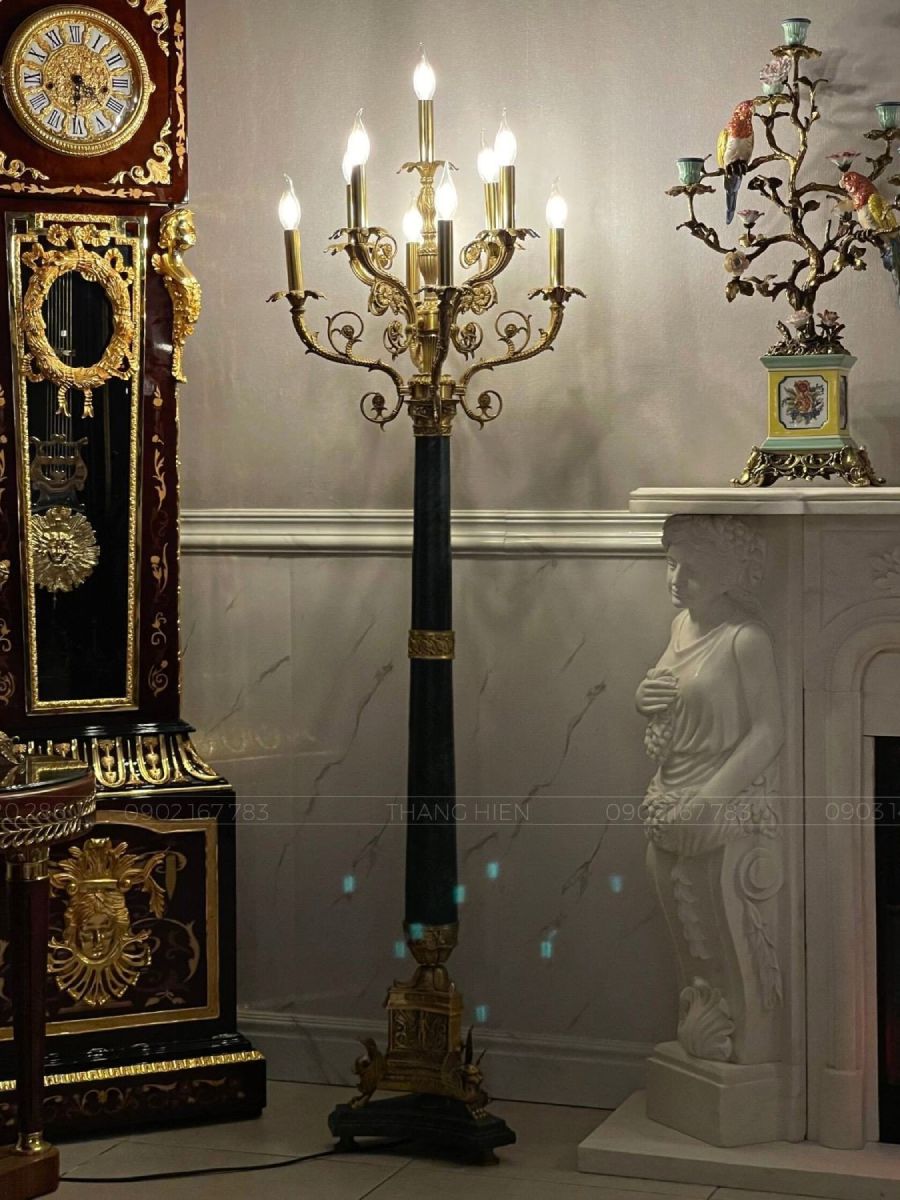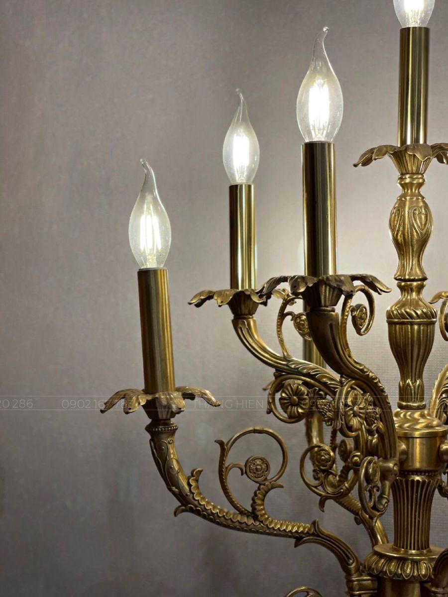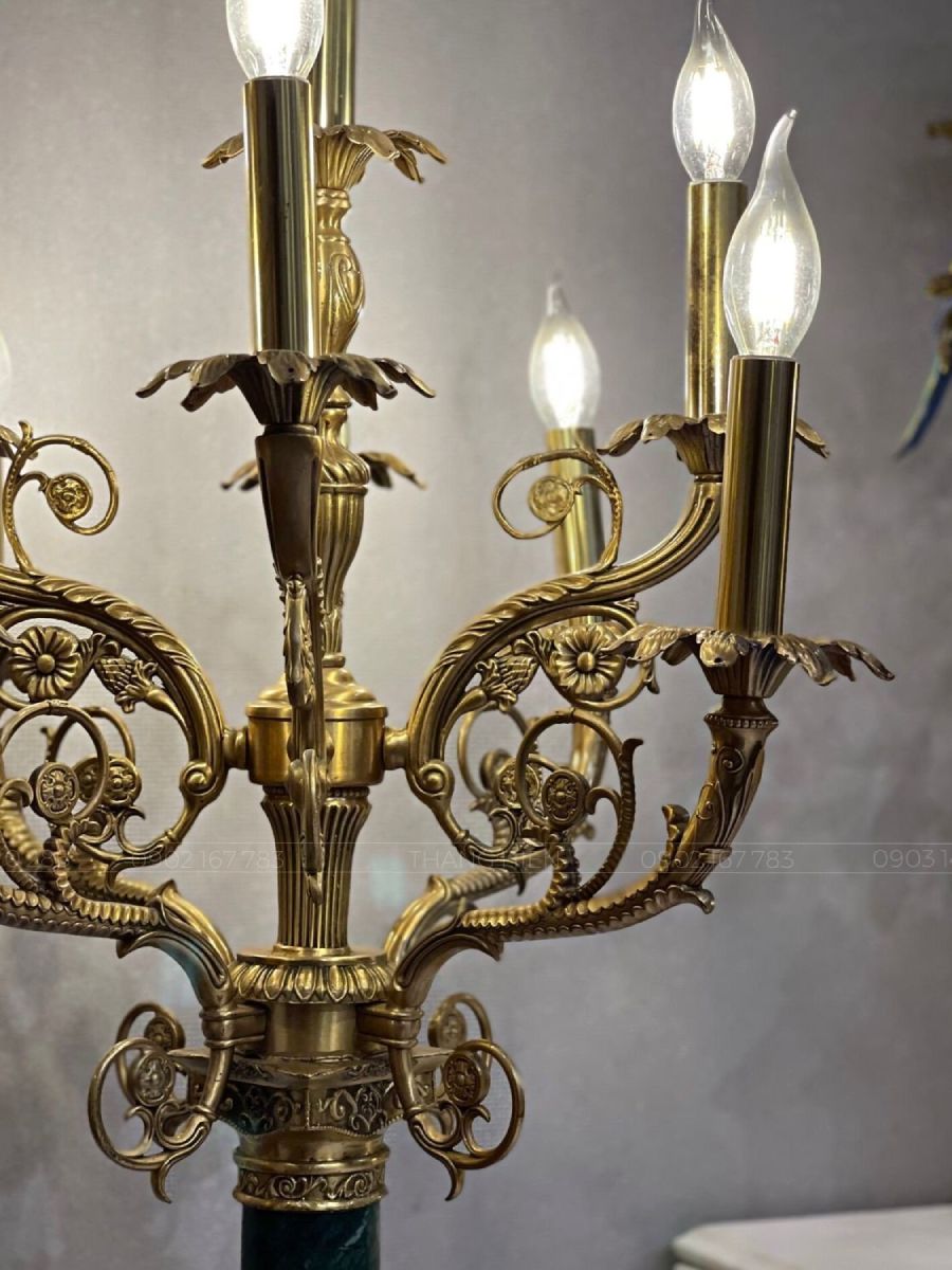 Đèn cây châu âu Đèn được thiết kế với 9 tay bằng đồng, tựa như bông hoa đang độ nở trên đó điểm xuyến các cành hoa và lá quấn quýt Đan xen nhau trông thật vui tươi sinh động