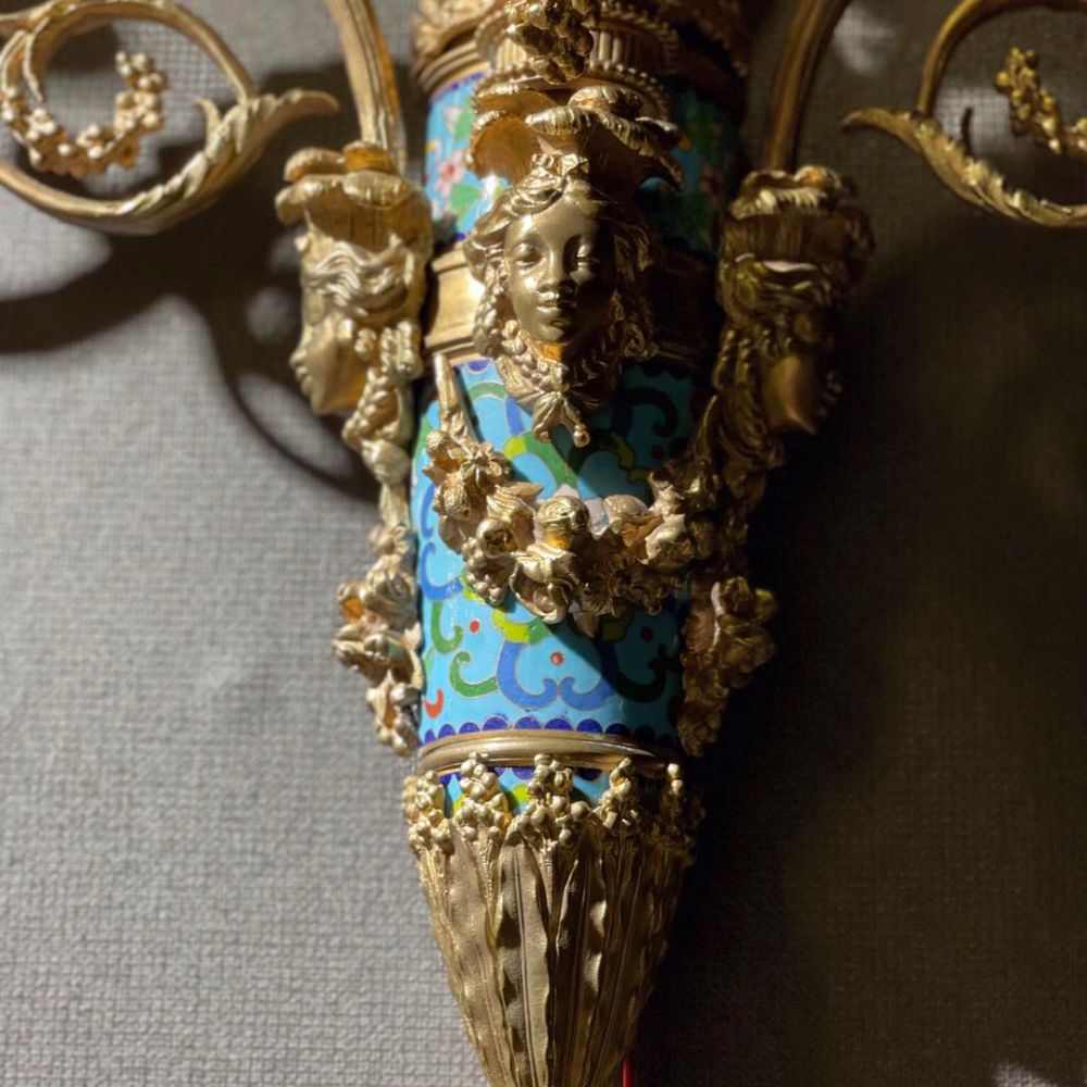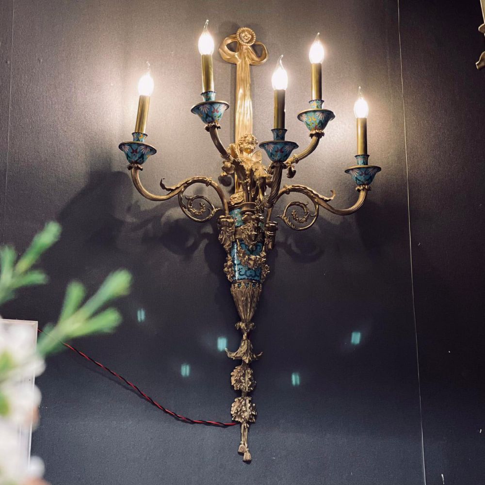 Đèn nến tường Pháp Lam được thiết kế với 5 tay đỡ nến. kết hợp cùng sứ và hoạ tiết uốn lượn bằng đồng vô cùng tỉ mỉ và bắt mắt. Cổ đèn có 4 mặt thiên thần, tiền tai, phú quý, may mắn, an lành cùng các chi tiết đòng tinh sảo.