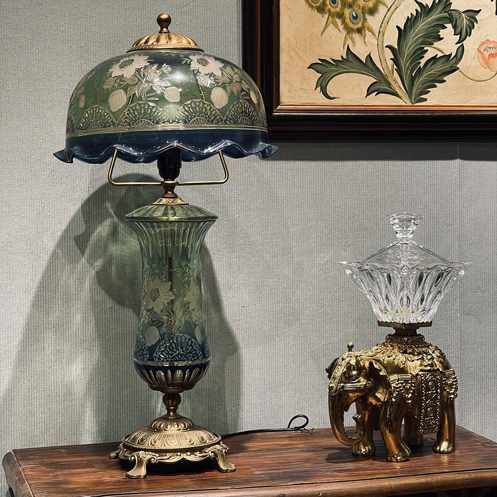 Với tone xanh các họa tiết hoa trắng được khắc sâu tựa như vườn hoa xuân trong nắng sớm rung rinh trong gió. Chao đèn bằng pha lê xanh với họa tiết lượn sóng ở. Đế đèn bằng đồng khắc hoa văn tạo ra điểm nổi bật và tăng tính thẩm mỹ cho sản phẩm