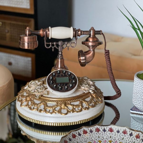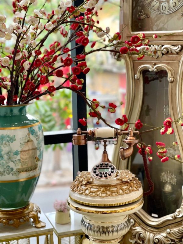 Điện thoại bàn cổ điển có các chi tiết được điêu khắc tinh xảo, kết hợp mạ vàng tự nhiên theo phong cách cổ điển, rất ấn tượng và vô cùng đẹp mắt giúp không gian sống của bạn trở nên sang trọng, cổ kính bất ngờ