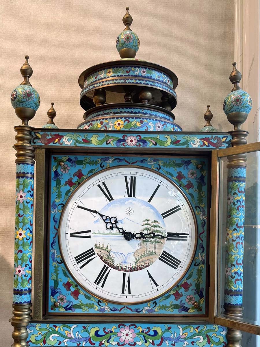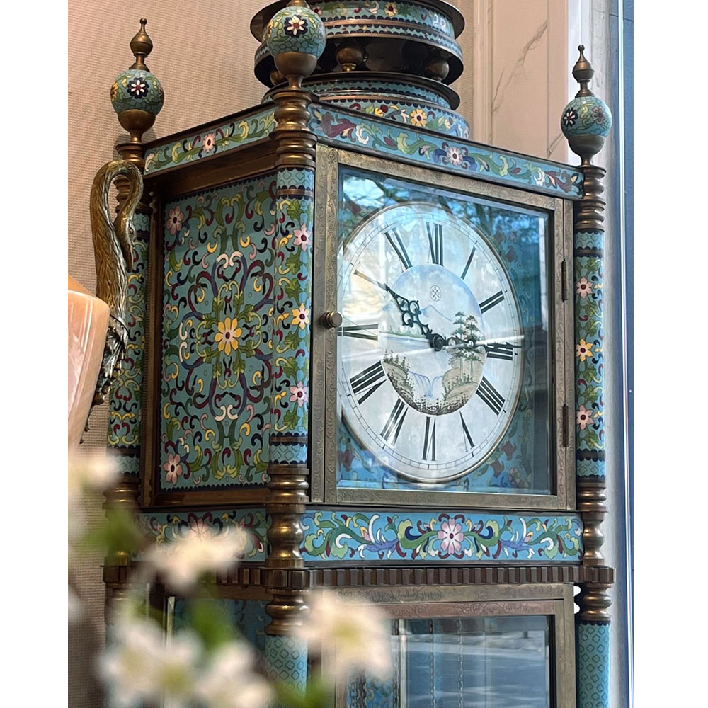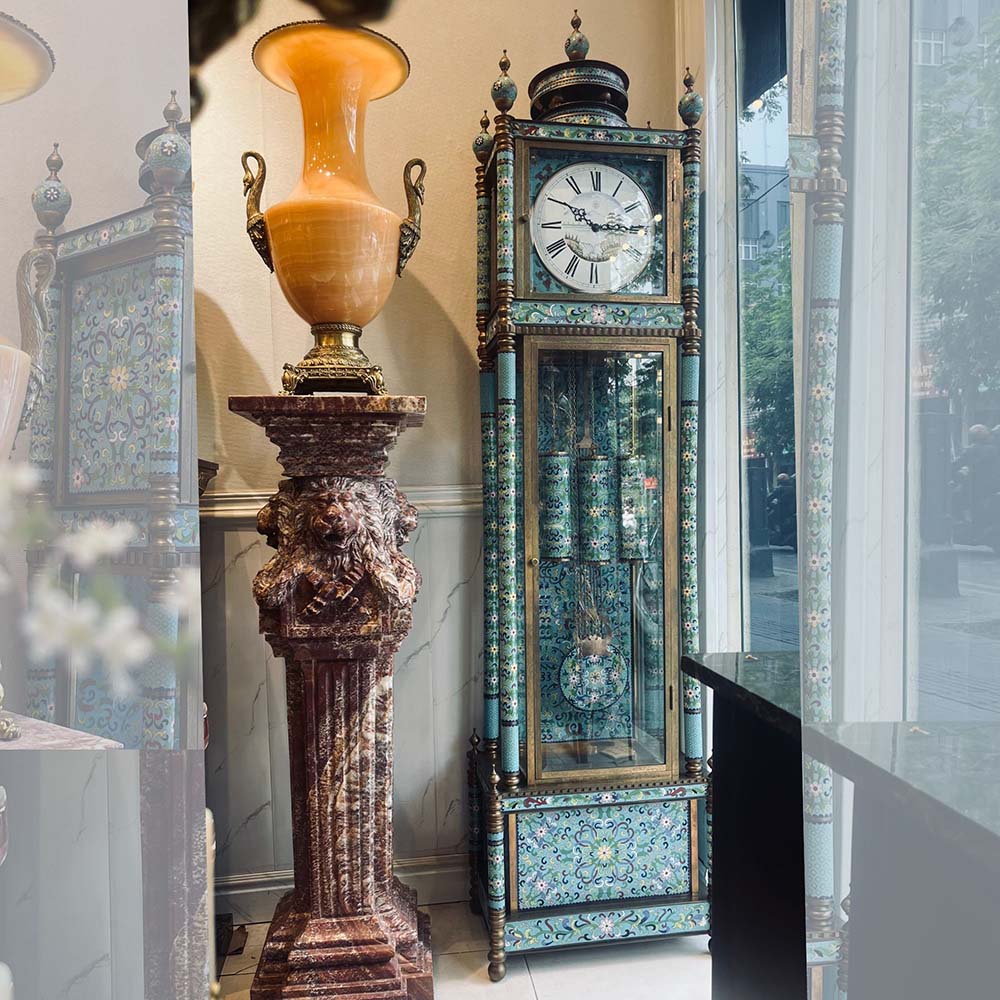 Đồng hồ cây lam Pháp được làm bằng đồng với các họa tiết hoa tone xanh dương được chạm khắc dọc, xung quanh đồng hồ từ đỉnh tới chân