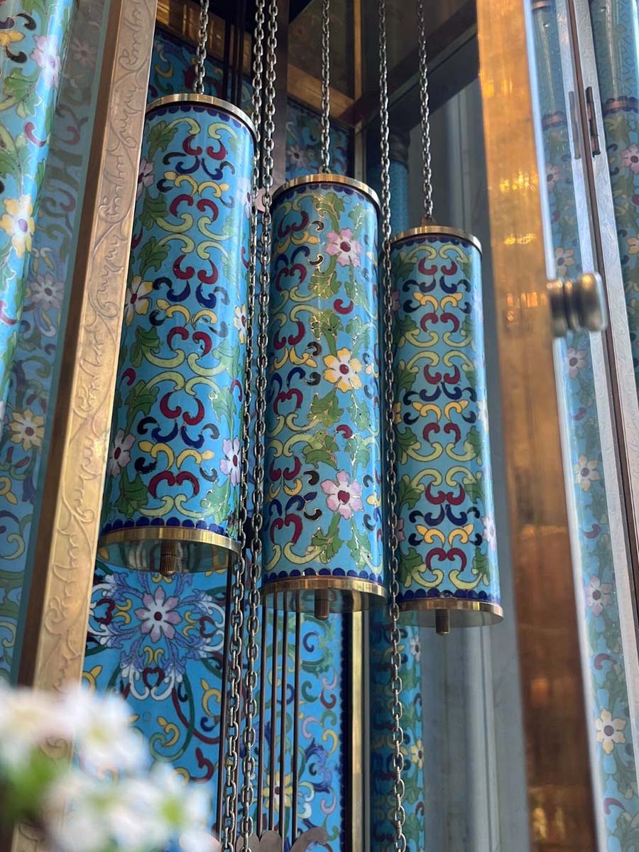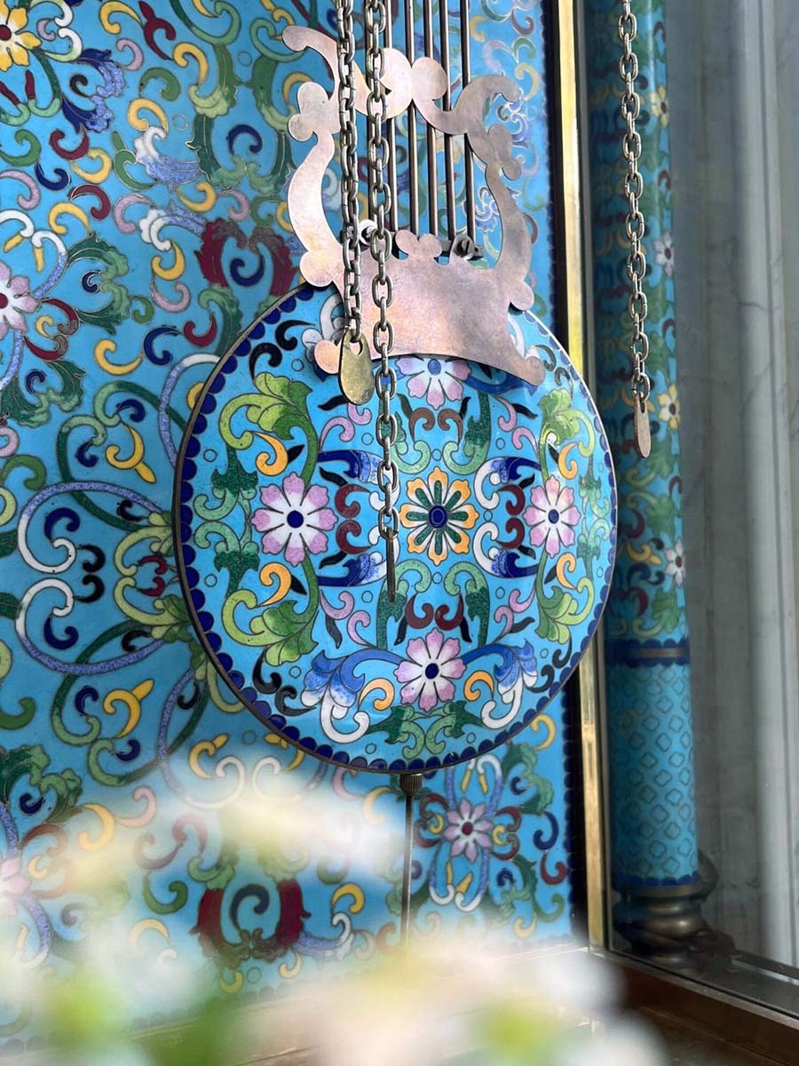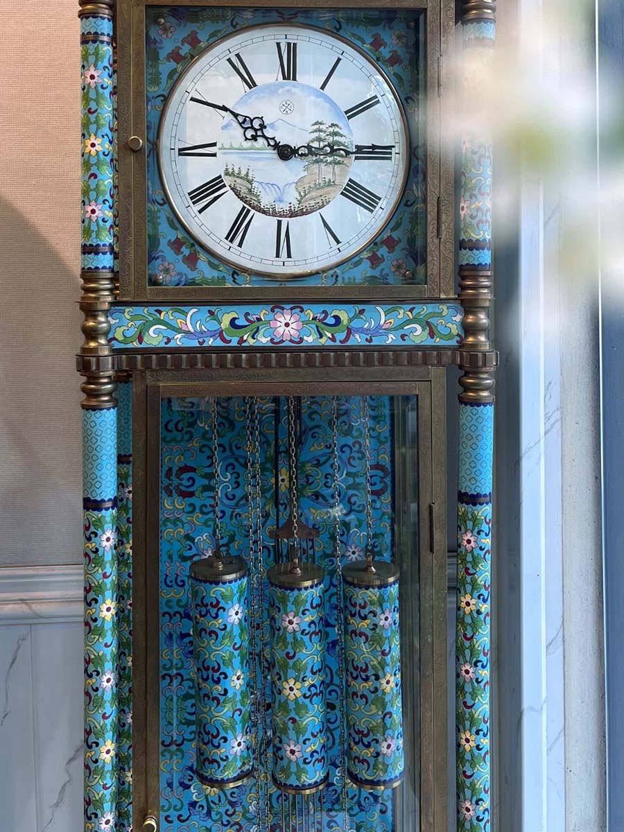 Đồng hồ cây lam Pháp được làm bằng đồng với các họa tiết hoa tone xanh dương được chạm khắc dọc, xung quanh đồng hồ từ đỉnh tới chân