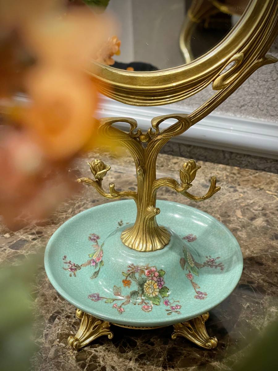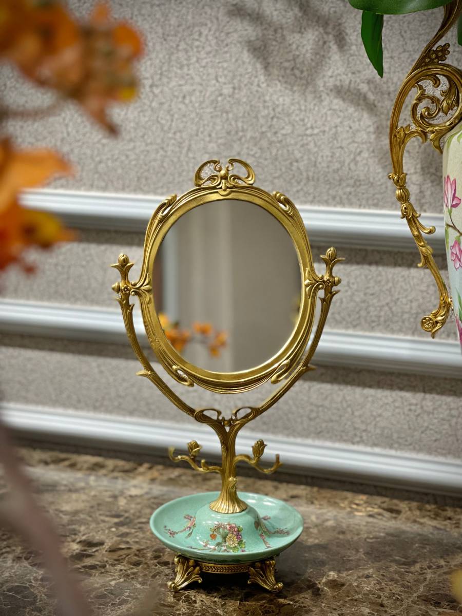 - Thiết kế sang trọng và thanh lịch: Gương được làm bằng đồng thau cao cấp, có độ sáng bóng cao và được mạ vàng hoặc bạc tinh xảo. Chân gương được làm bằng sứ cao cấp, được vẽ hoa văn tinh tế và sắc sảo.