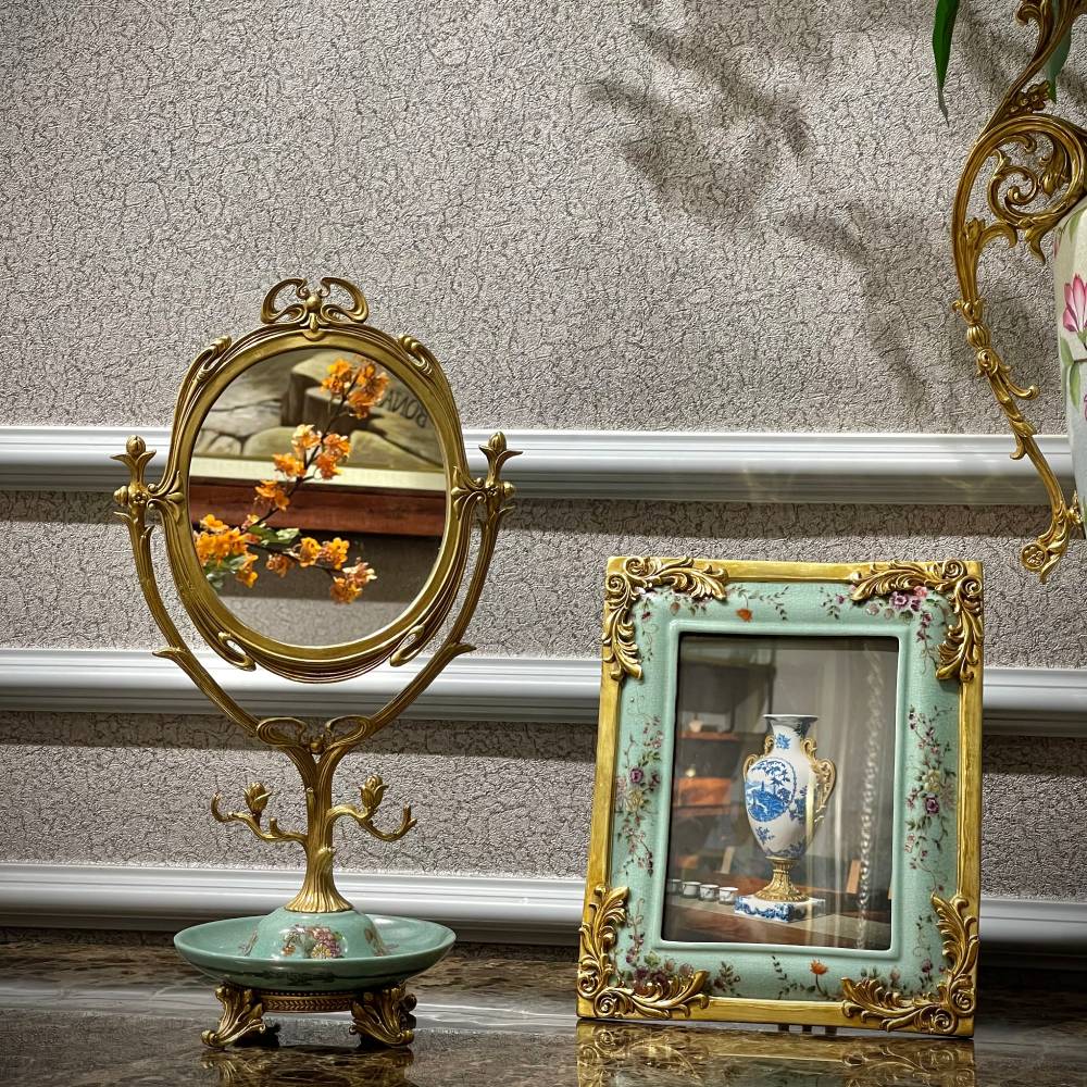 Gương để bàn đồng chân gương lõm bằng sứ vẽ hoa văn