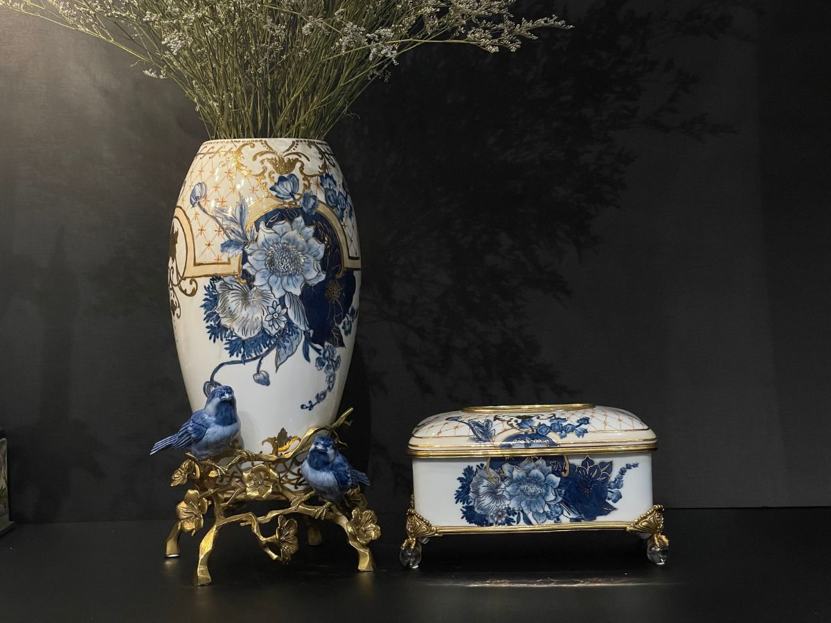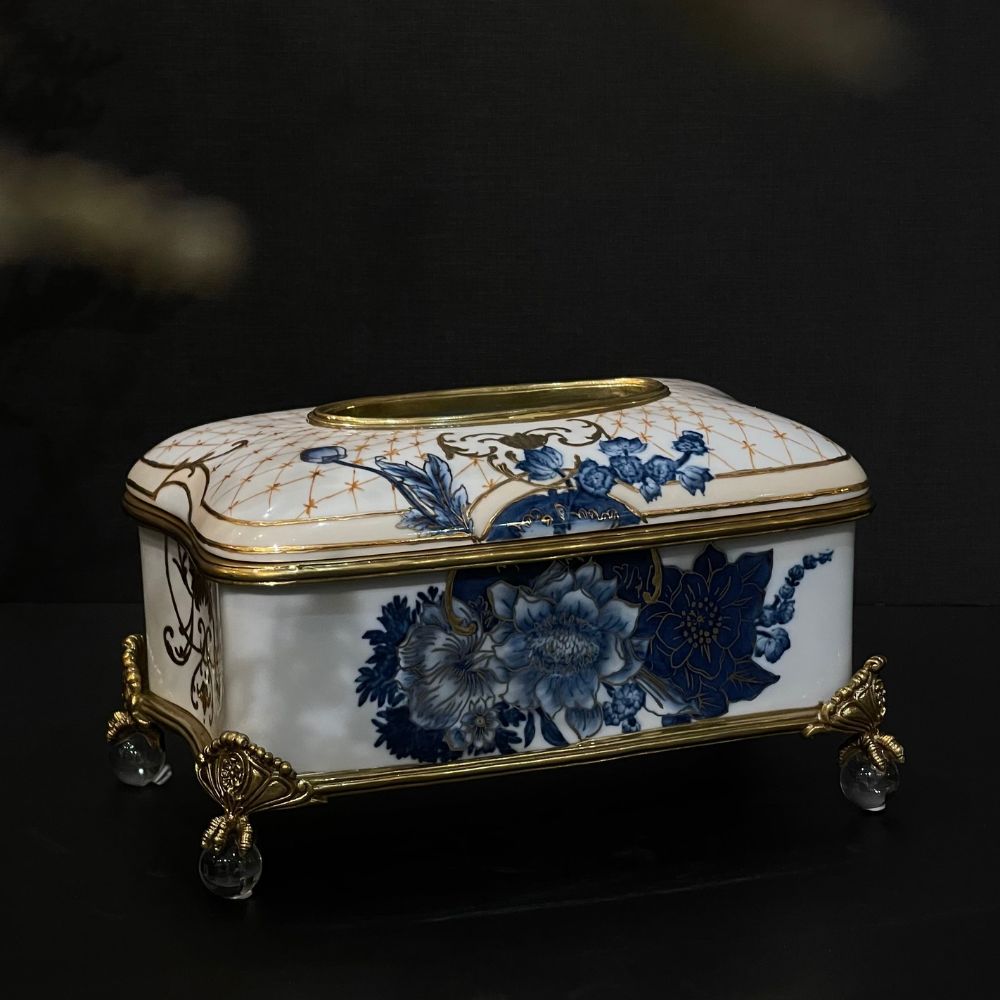 Hộp đựng giấy sứ tone trắng với những dải hoa được vẽ thủ công trên nắp, xung quanh hộp có thể bày ở phòng khách, phòng ăn, phòng ngủ,… hay làm quà tặng tân gia, đám cưới,… sang trọng