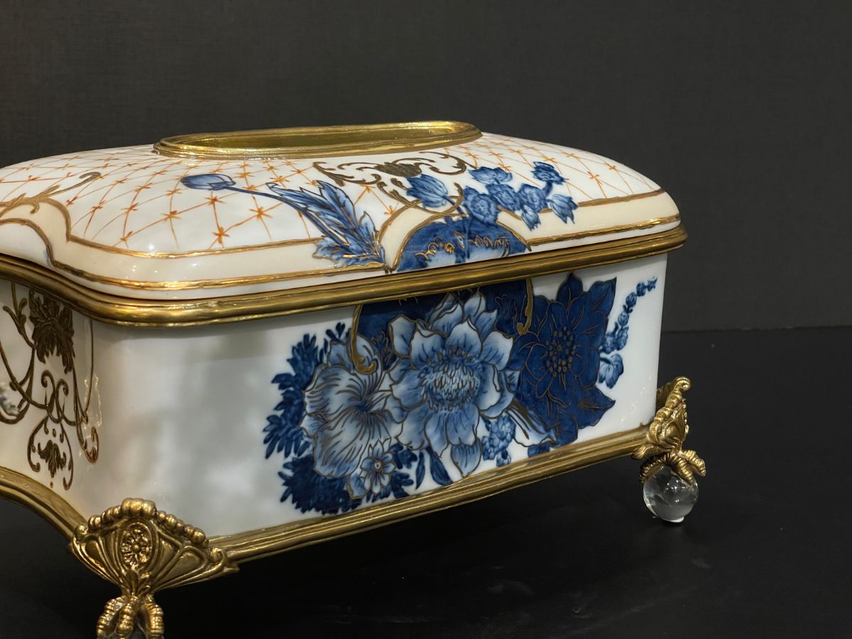 Hộp có nắp mở dễ dàng với viền đồng xung quanh miệng và bốn chân đồng hình hoa nâng đỡ hộp bên trên