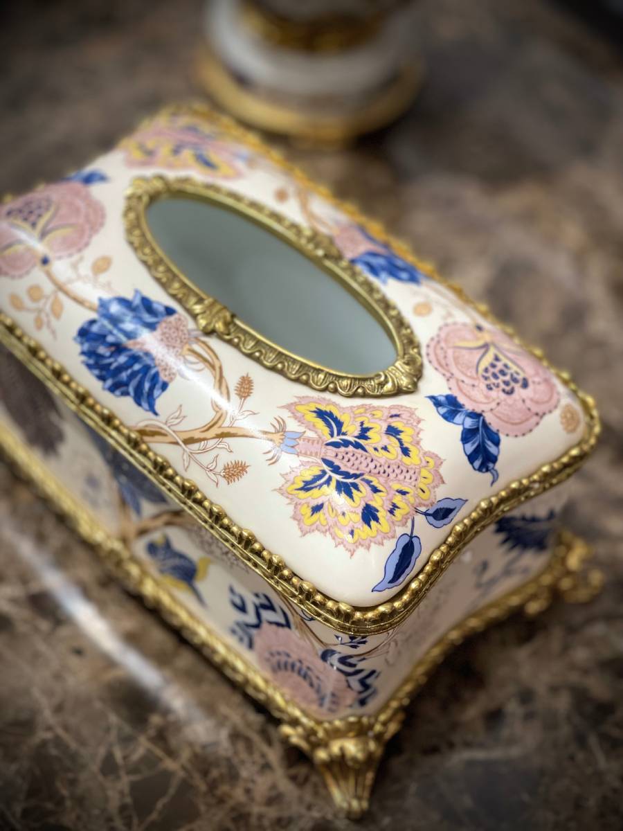 Hộp giấy sứ họa tiết hoa văn kết hợp đồng là một sản phẩm trang trí nội thất cao cấp được làm từ chất liệu sứ cao cấp, bền đẹp. Bề mặt hộp được trang trí bằng những họa tiết hoa văn tinh xảo, kết hợp với đường viền đồng sang trọng, tạo nên vẻ đẹp độc đáo và thu hút. Hộp giấy sứ có thể được sử dụng để đựng giấy ăn, hoặc các vật dụng nhỏ khác trên bàn trang điểm, bàn làm việc hay kệ sách.
