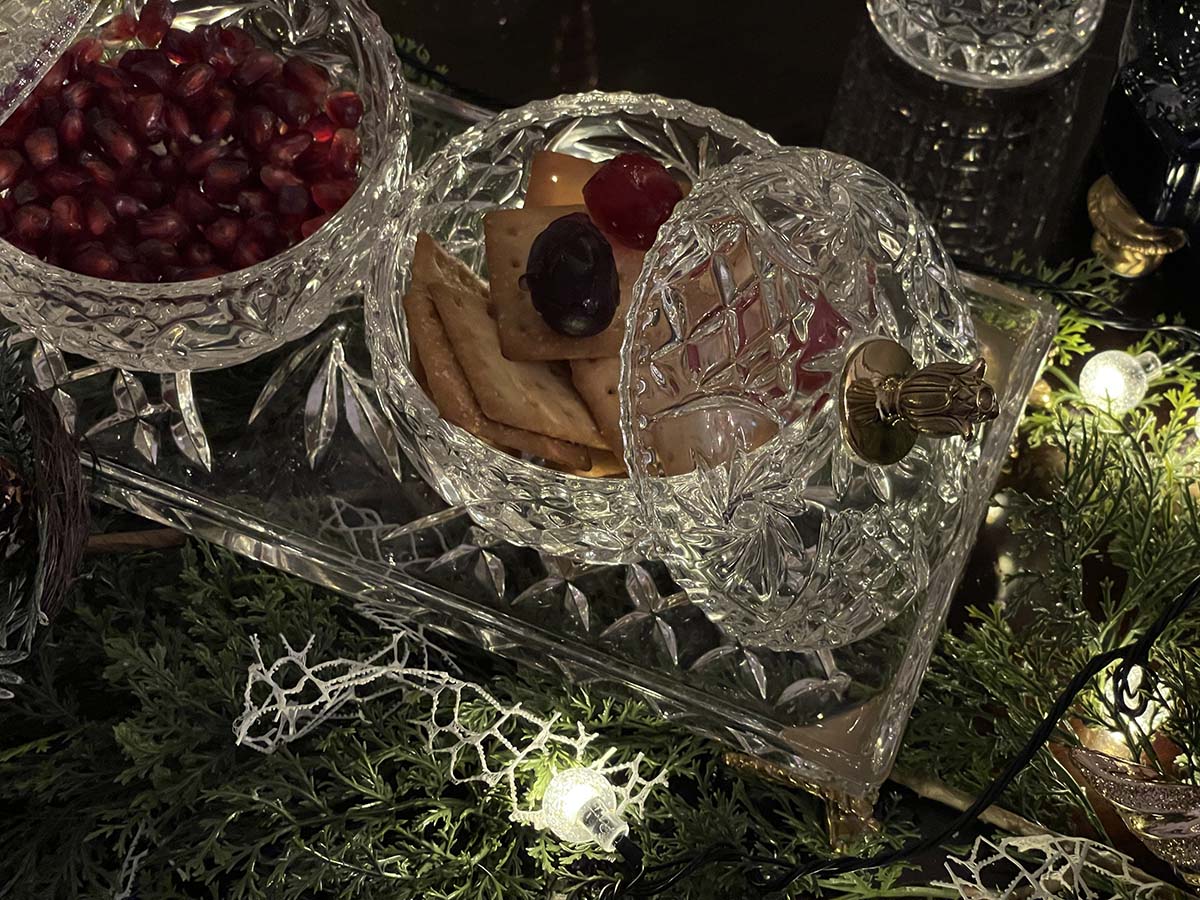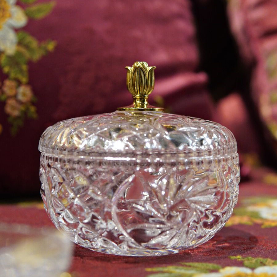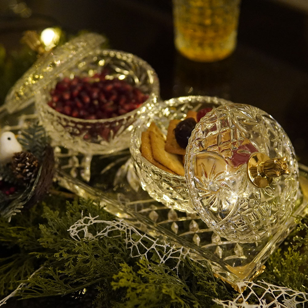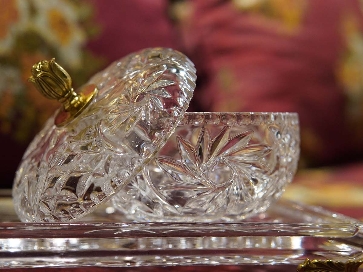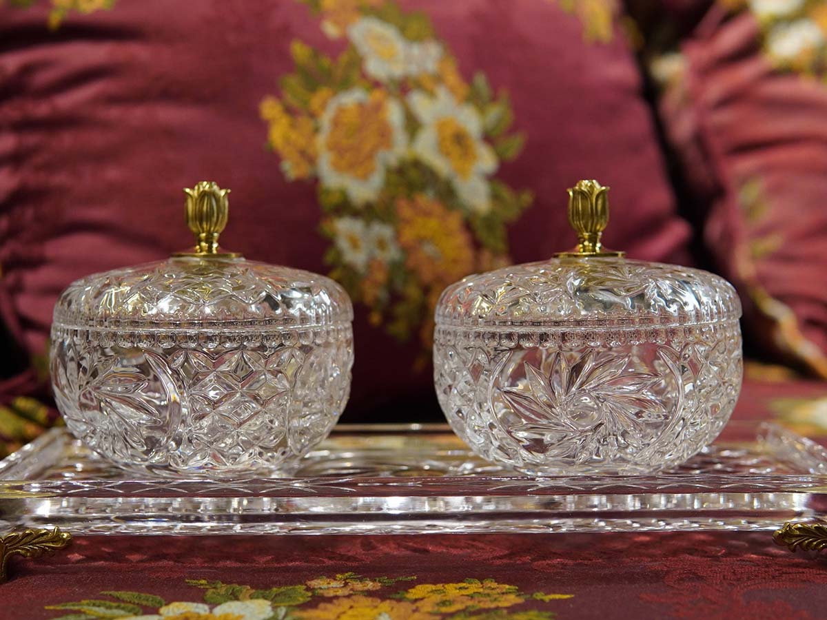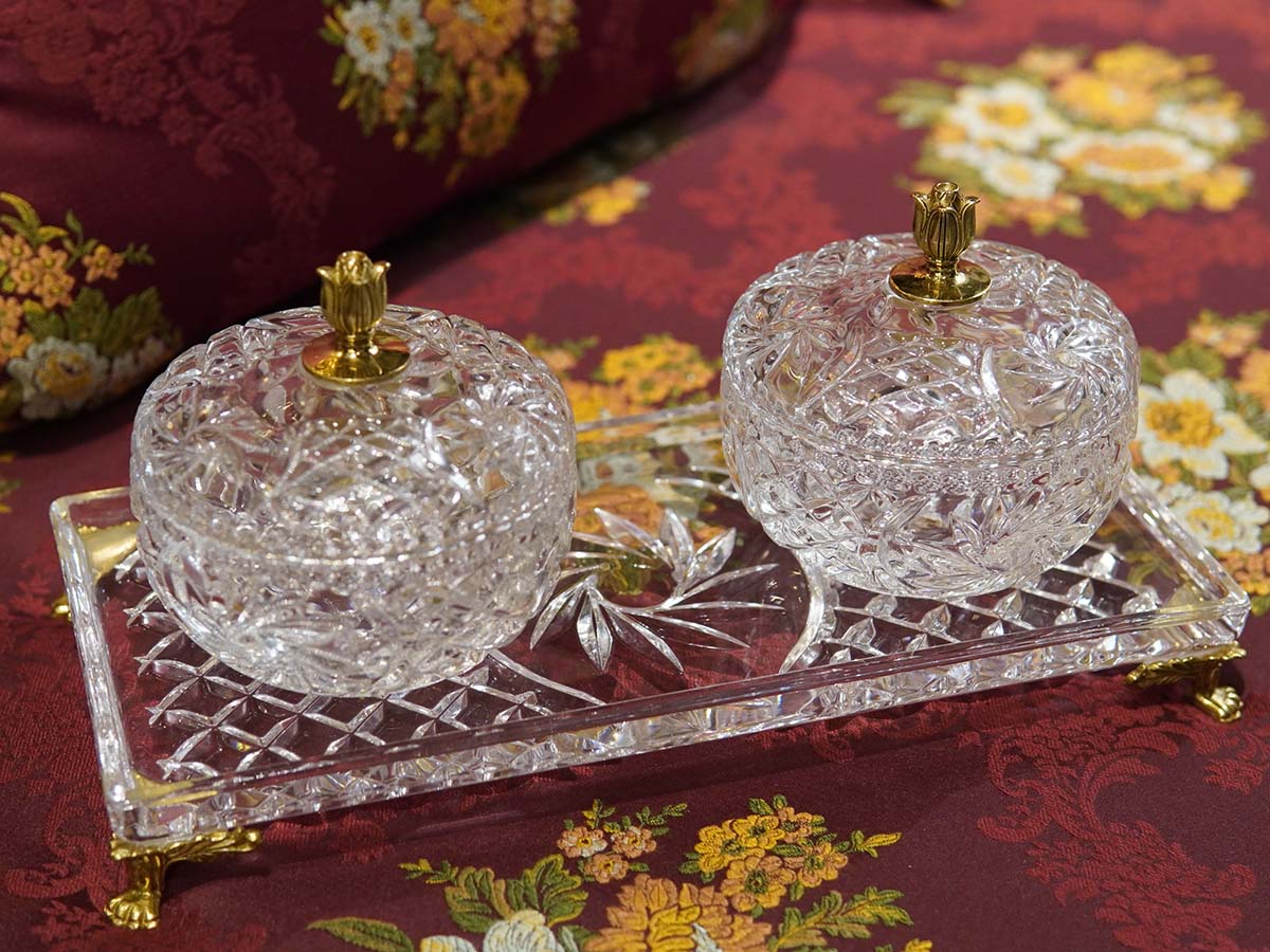 Hộp pha lê 2 ngăn với các họa tiết khắc trên thân, nắp, khay tạo điểm nhấn cho sản phẩm.