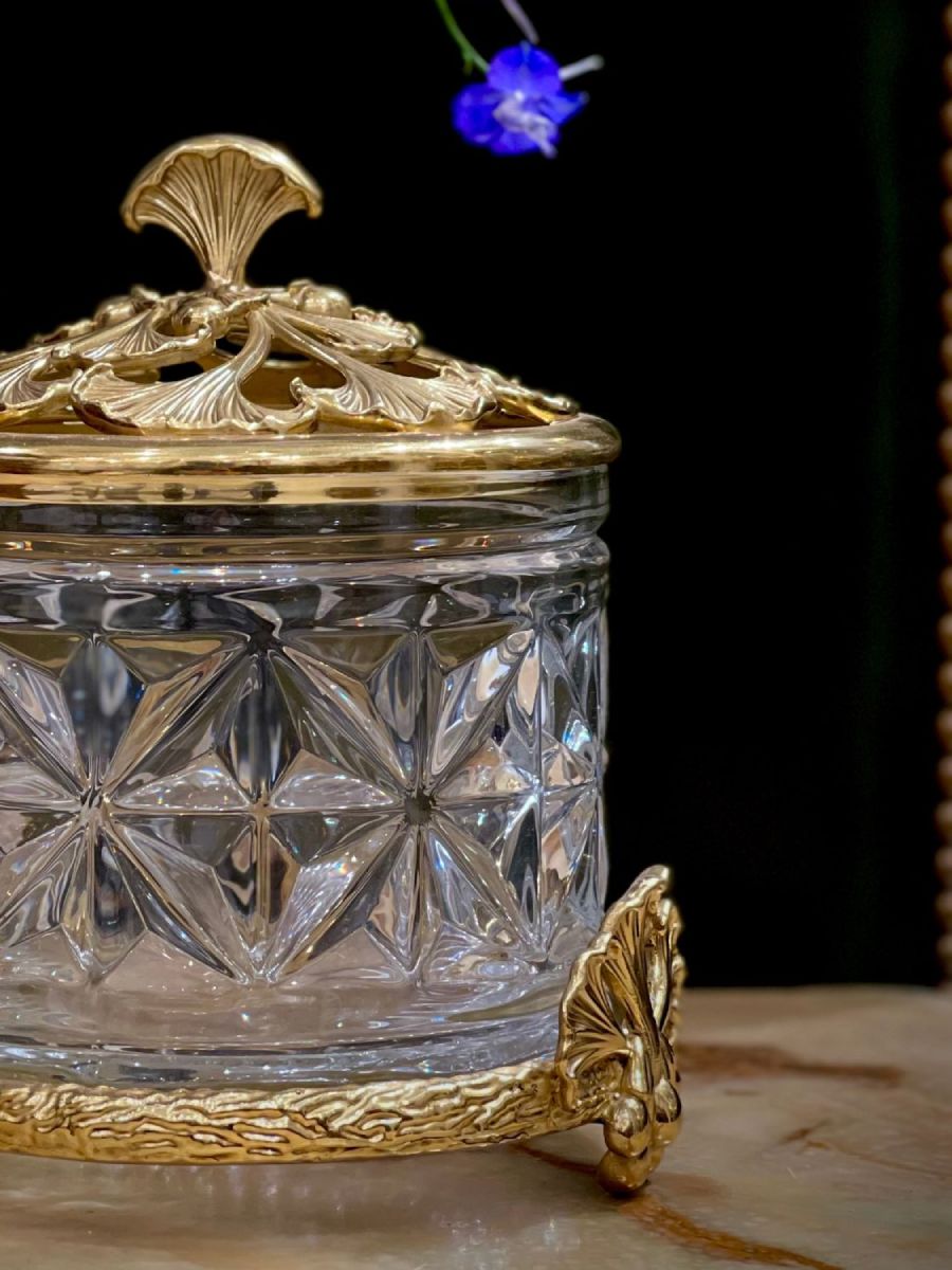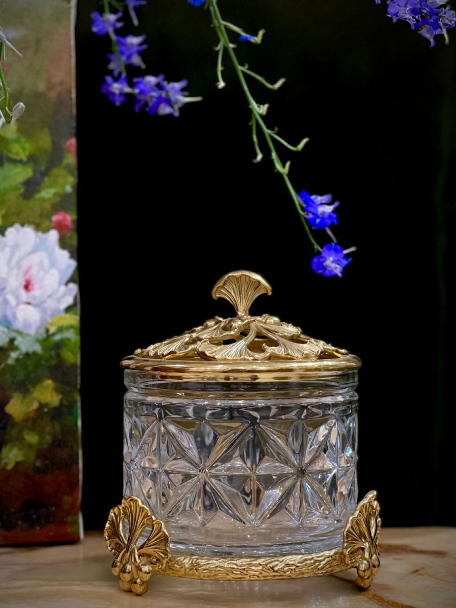 Hộp pha lê Châu Âu với các họa tiết trang trí được khắc sâu trên bề mặt cùng hoa văn đồng được vẽ vàng trên nắp, và phần chân đế thích hợp bày trang trí nhưng cũng có tính ứng dụng cao để kẹo, mứt,… hoặc món quà tặng ý nghĩa.