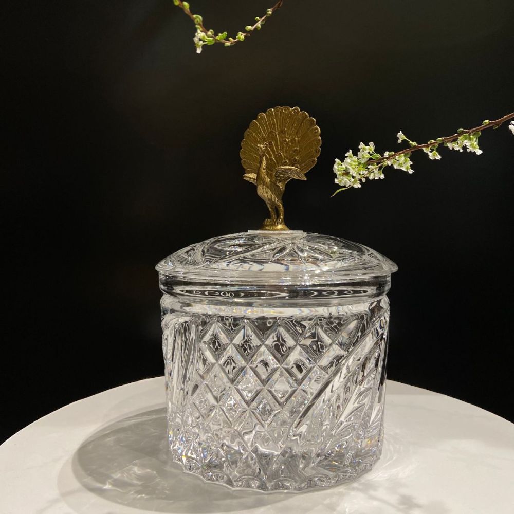 Hộp pha lê Châu Âu với các họa tiết trang trí được khắc sâu trên bề mặt cùng hoa văn đồng, trên nắp hộp tay cầm là hình ảnh chim công bằng đồng cùng phần chân đế, thích hợp bày trang trí nhưng cũng có tính ứng dụng cao để kẹo, mứt,… hoặc món quà tặng ý nghĩa cho đối tác bạn bè và người thân.