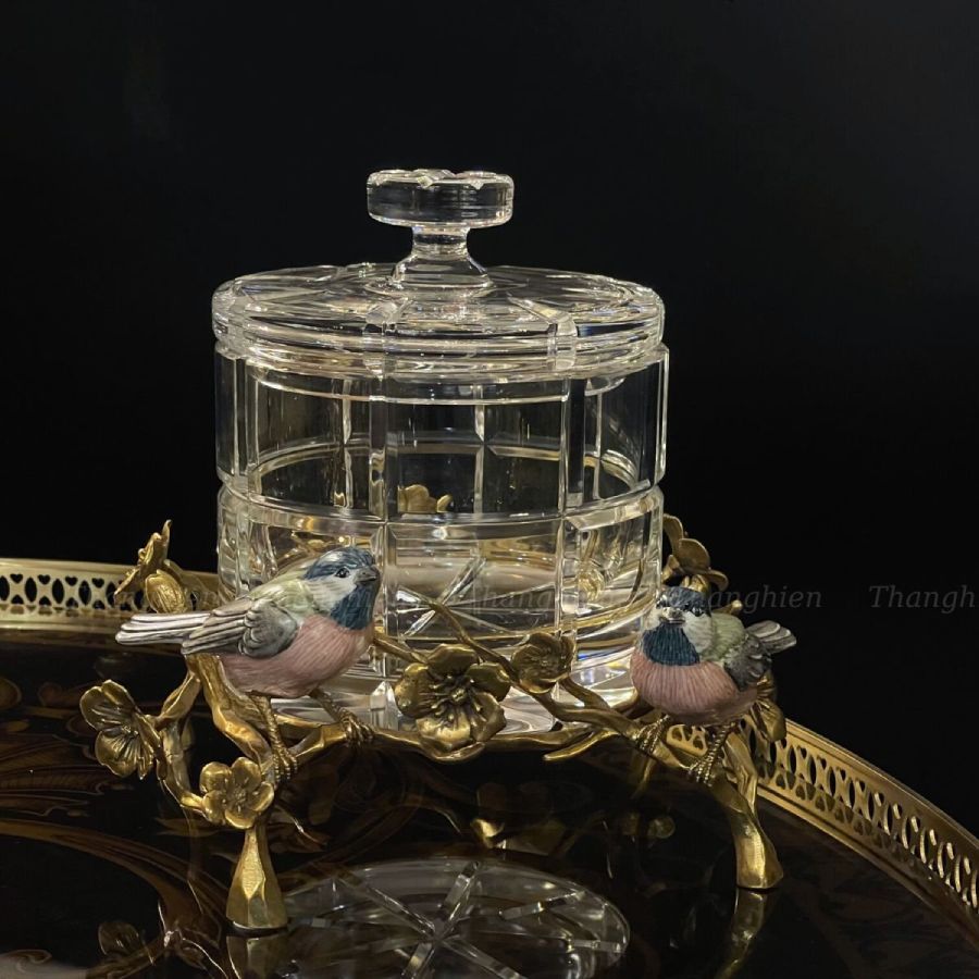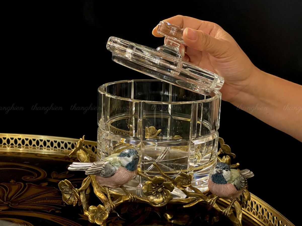 Hộp pha lê mùa xuân được tạo nên từ phale kèm hoạ tiết hoa mai bằng đồng và những chú chim bằng sứ tạo nên điểm nhấn cực kỳ mềm mại. thiết kế có nắp hộp tiện lợi lau chùi.