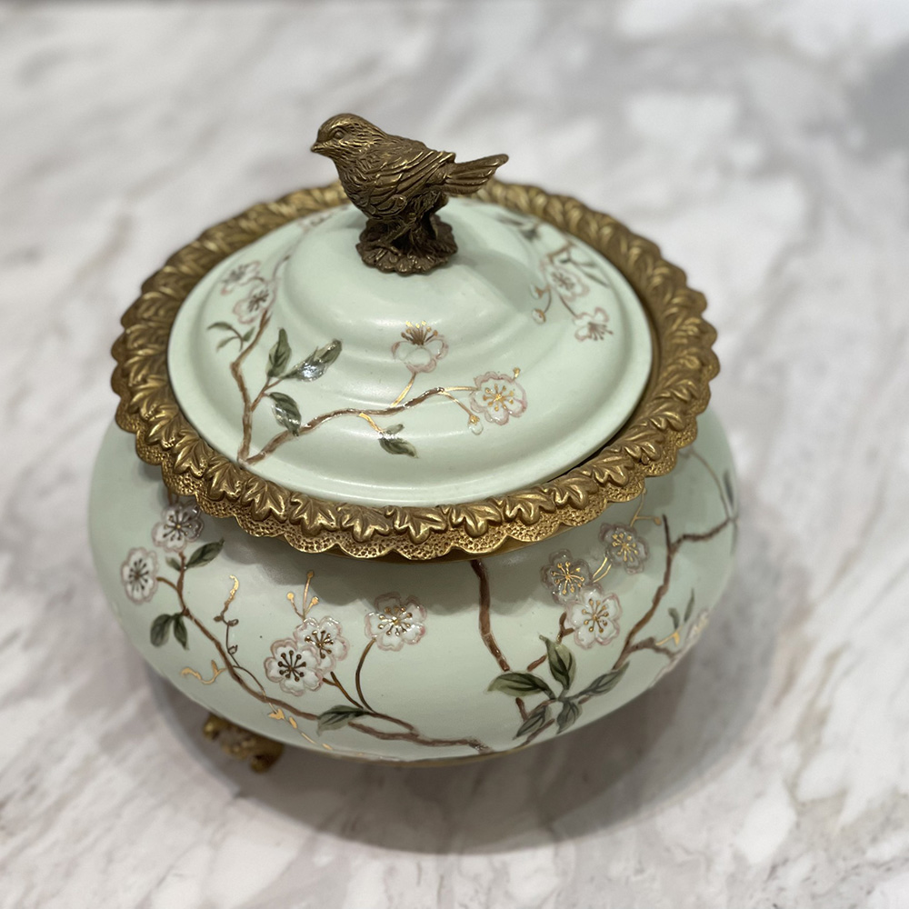 Hộp sứ trang trí tone xanh với họa tiết hoa đào cùng lá xanh được vẽ xung quanh hộp giống như bức tranh xuân rực rỡ. Một chú chim đồng trên nắp giúp cho bức tranh thêm sinh động, trong động có tĩnh và trong tĩnh có động. Chim đồng không chỉ có tính thẩm mỹ mà tiện lợi cho việc đóng mở.