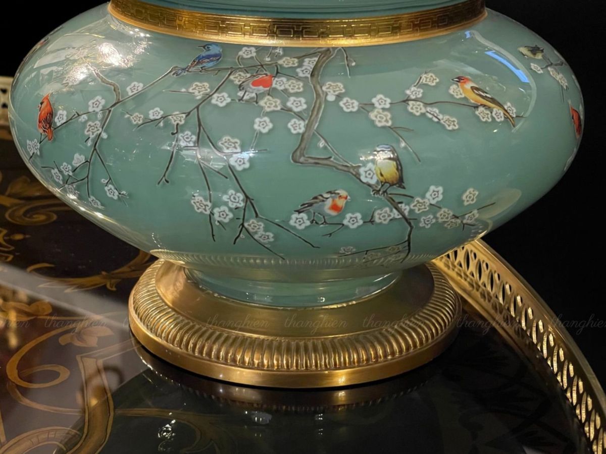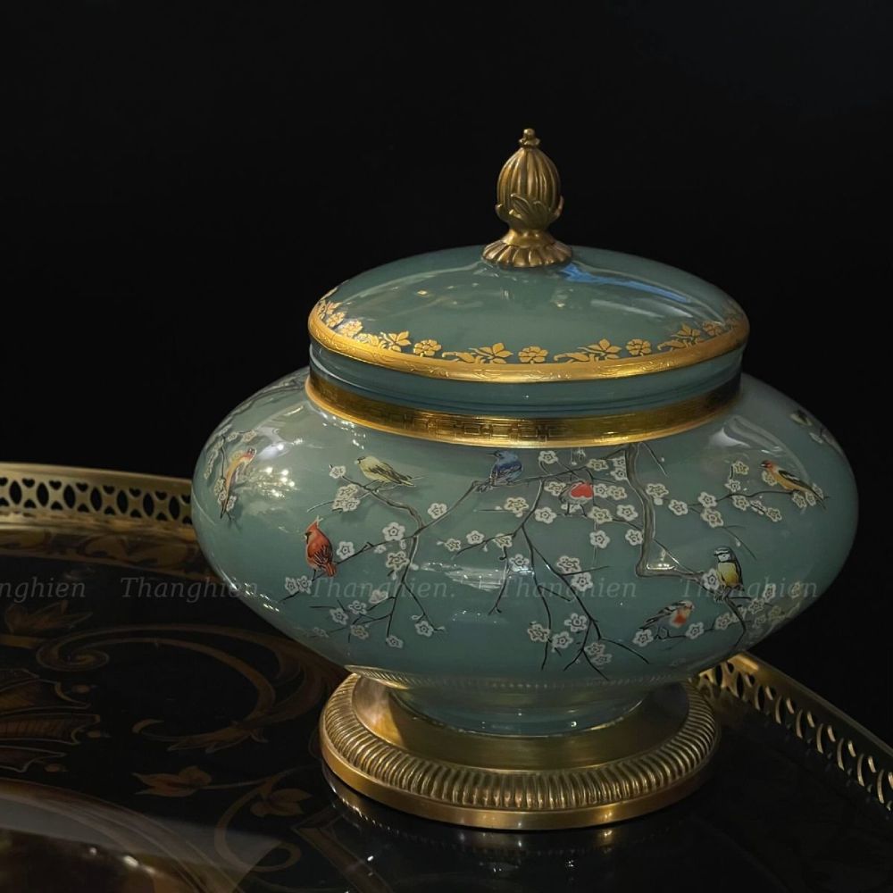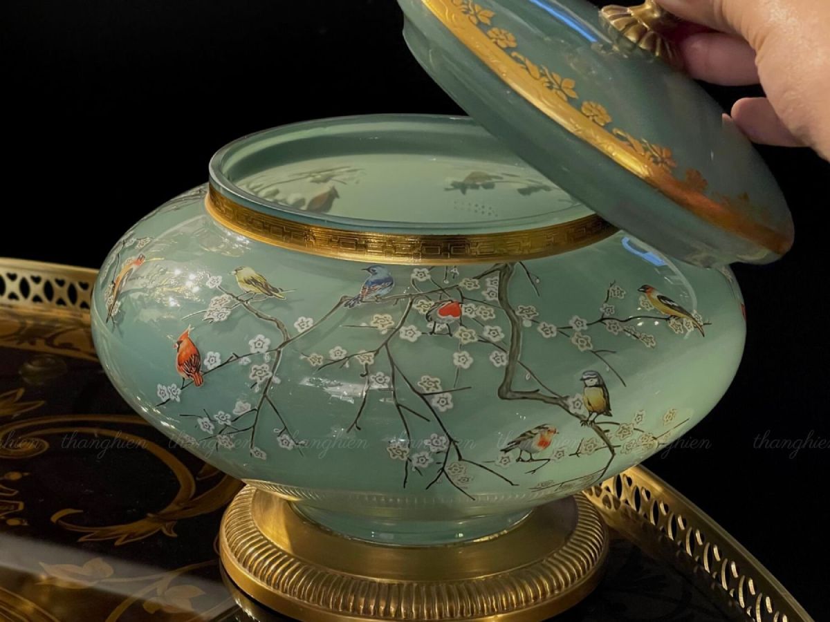 Hũ thuỷ tinh trang trí được tạo nên từ thuỷ tinh cao cấp màu xanh biển cả trong cực dịu mắt, vẽ hoạ tiết rừng hoa và chim hót rực rỡ , phần nắp hộp được thiết kế hoạ tiết hoa bằng đồng mạ vàng công nghiệp.