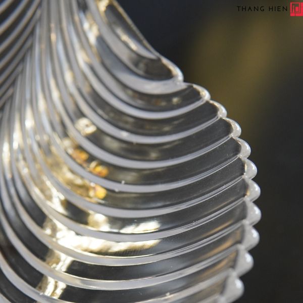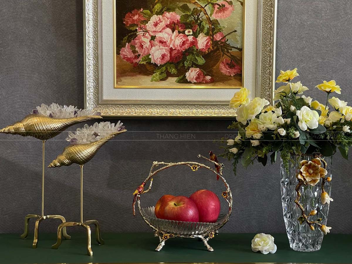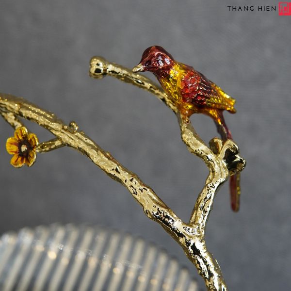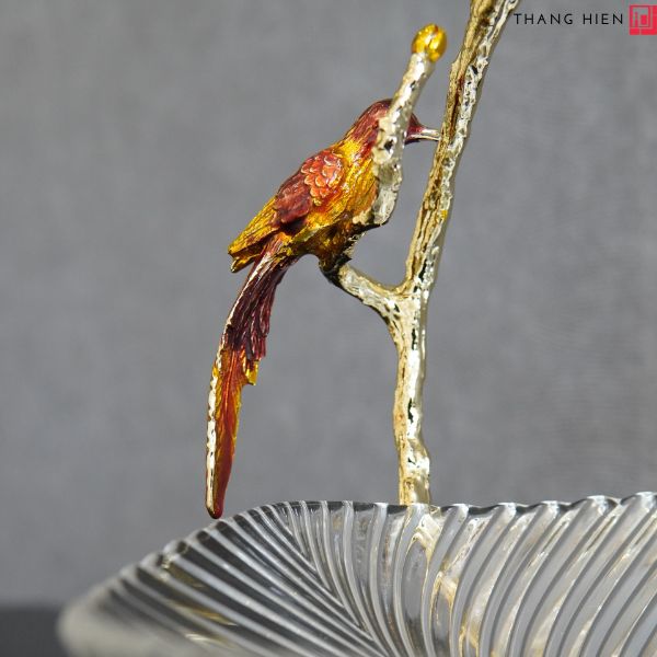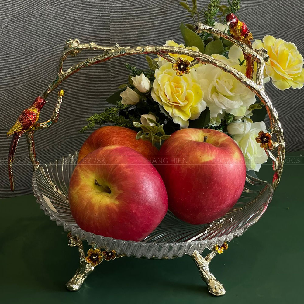 Được làm bằng thủy tinh theo hình chiếc lá có thể nhấc ra để vệ sinh nên rất tiện. Quai giỏ với bốn chân đỡ được làm bằng antimon mạ vàng có đôi chim họa mi đang hót líu lo trên quai giỏ. Khay thích hợp để đặt ở nhiều vị trí khác nhau như bàn phòng khách, phòng ăn, khu sinh hoạt chung hay món quà tân gia, đám cưới ý nghĩa.
