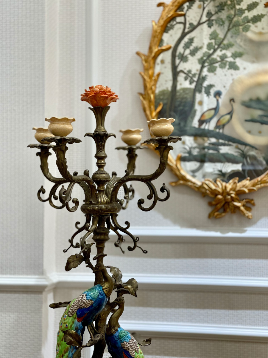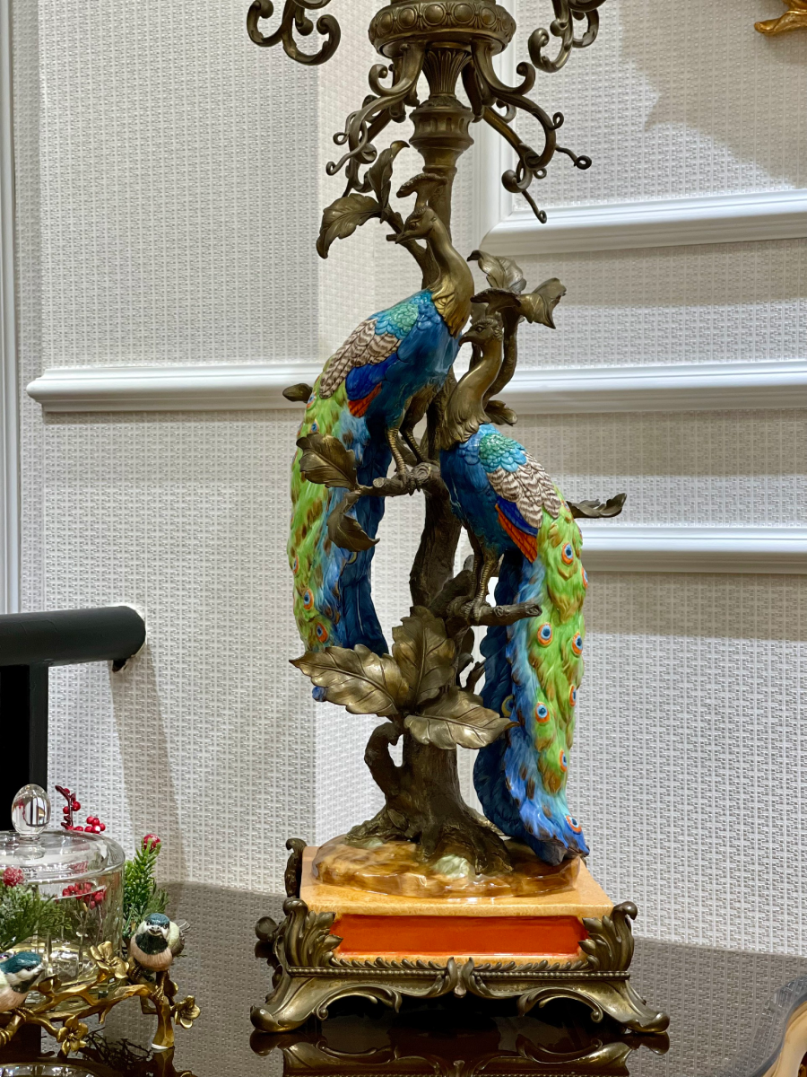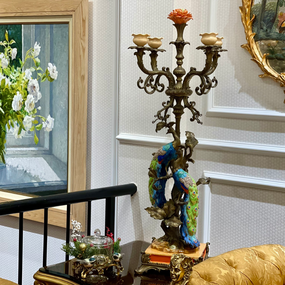 Bên cạnh khóm hoa đôi chim công đang tỏ tình với bộ lông sặc sỡ bằng đồng được vẽ tay tỉ mỉ. Tác phẩm nghệ thuật nhưng cũng mang tính ứng dụng cao. Có thể dùng để trưng bày ở các sảnh khi kết hợp với các món đồ khác hoặc bày một mình trên đôn góc hay trên bàn ăn,…