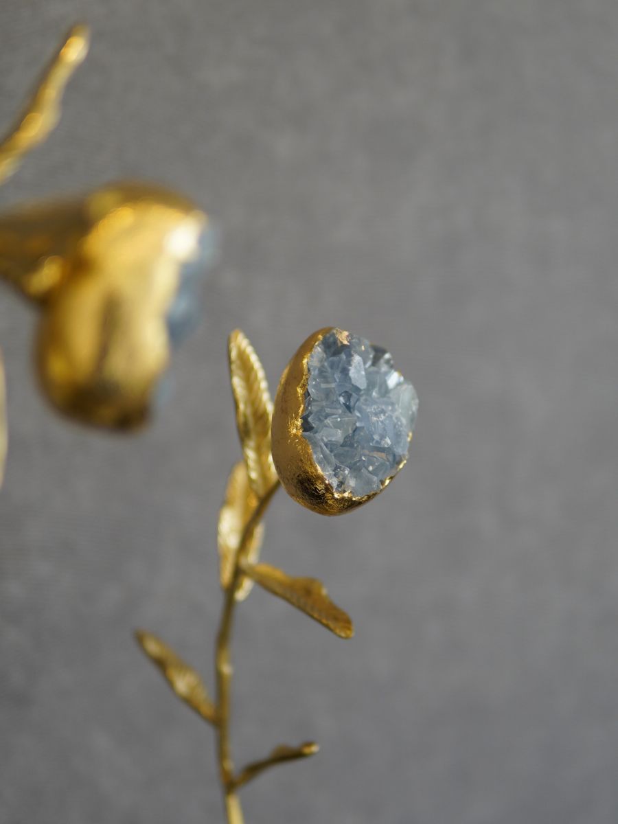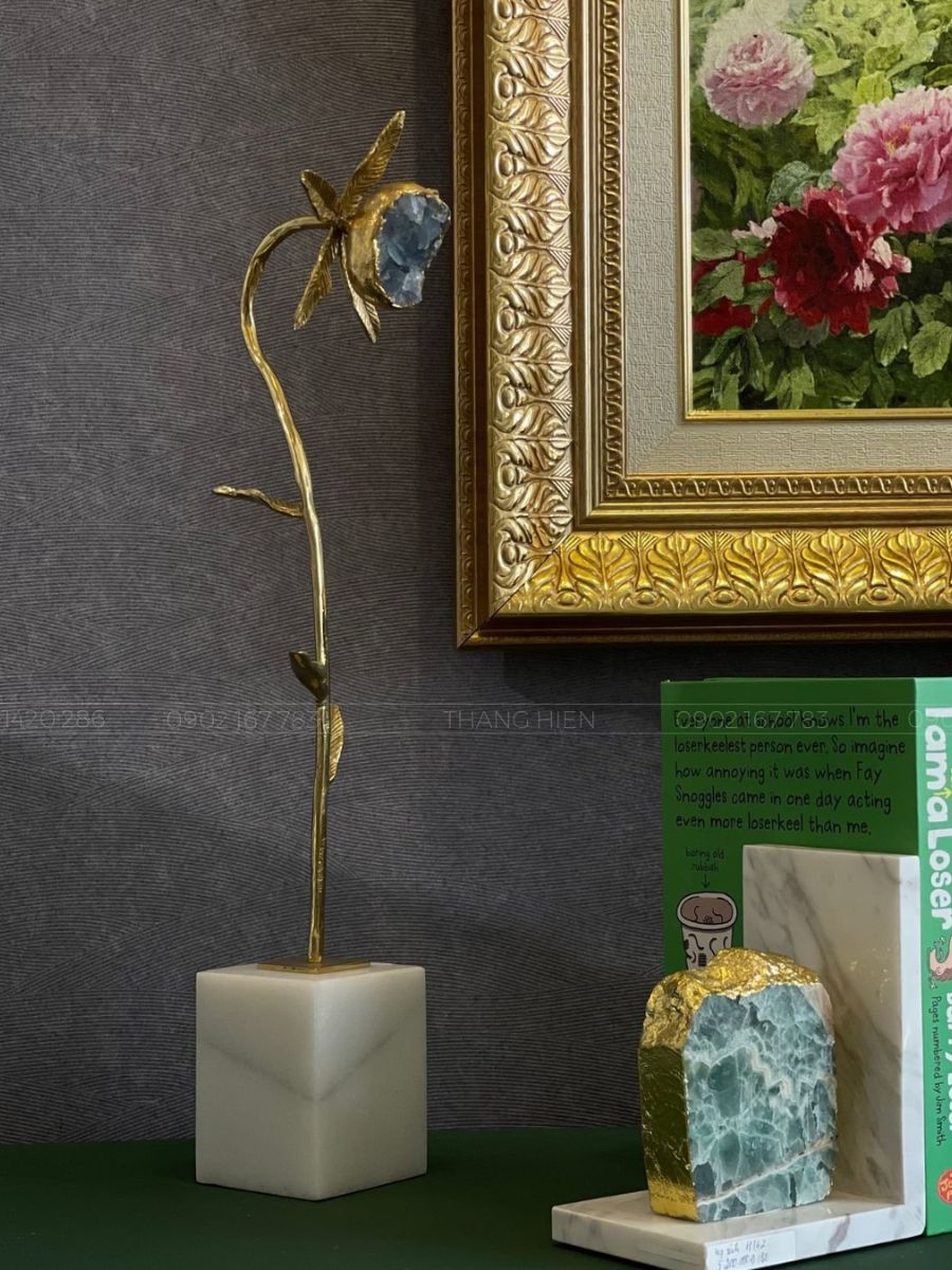 Nụ xuân đá thạch anh được tạo nên bằng đồng với nhụy bằng đá thạch anh xanh tự nhiên, đế hoa là khối đá cẩm thạch trắng vô cùng sang trọng.