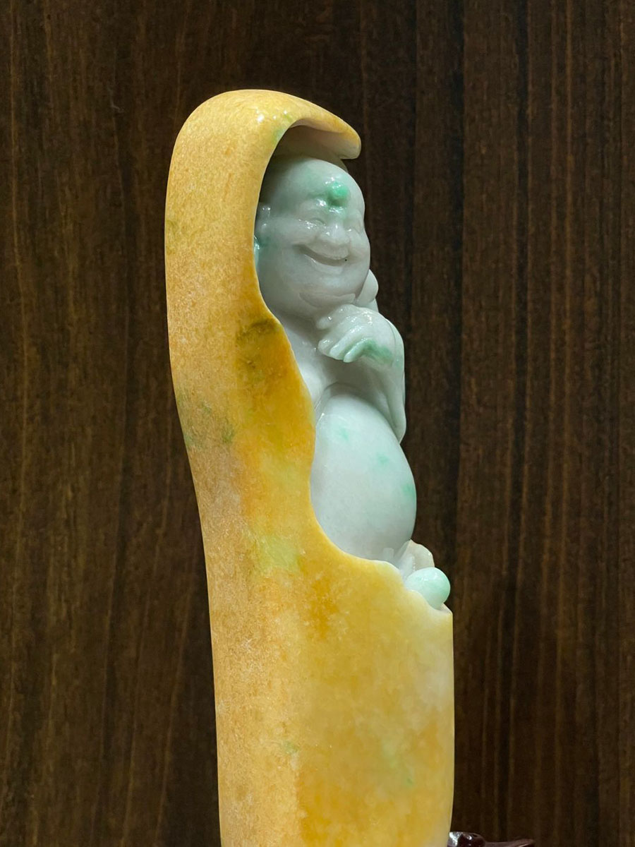 Được làm từ nguyên khối ngọc chọn lọc rất kỹ trong hàng triệu khối mới được một khối đẹp như thế có màu vàng, điểm xanh trên nền trắng. Tượng Phật Di Lặc ngọc được đặt trên khối gỗ được chạm khắc hình thỏi vàng
